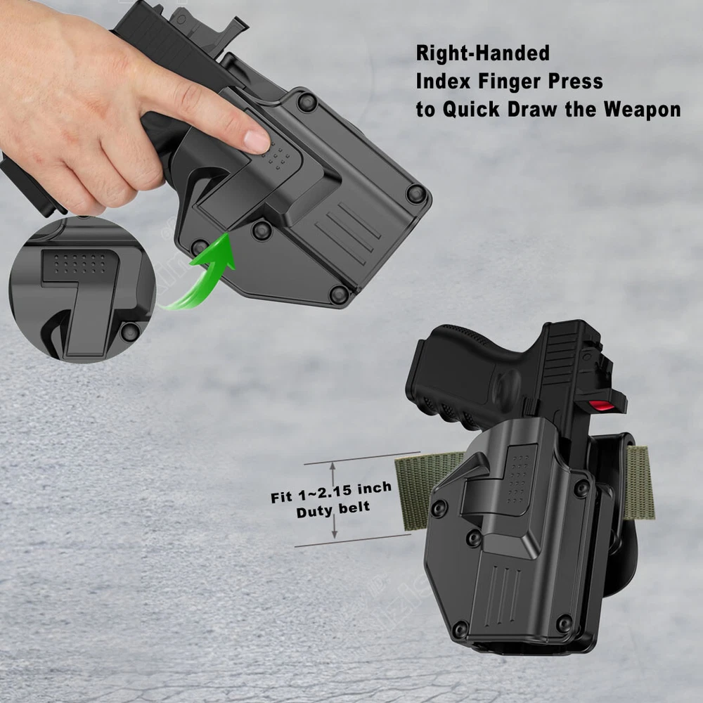 Mega-fit Holster / Versatile Holster / Universal Holster, Fits Most Popular Full Size and Compact Pistols, Fits Pistols with Red Dot, Fits Pistols with High Front Sight I tem D escription : Holster fit Beretta Beretta 92FS 9mm Luger Beretta 92X Performance 9mm Luger Beretta 92 9mm Luger Beretta 92X Centurion 9mm Luger Beretta 92S Full Size 9mm Luger Beretta 92G Elite LTT 9mm Luger Beretta M9 9mm Luger Beretta M9A1 9mm Luger Beretta M9A3 (without laser) 9mm Luger Beretta M9A4 9mm Luger Beretta PX4 Storm Full Size 9mm Luger Beretta PX4 Storm Compact 9mm Luger Beretta PX4 Storm Subcompact 9mm Luger Beretta APX Full Size 9mm Luger Beretta APX Centurion 9mm Luger Beretta APX Compact 9mm Luger Beretta APX Carry 9mm Luger Beretta APX A1 Carry 9mm Luger Beretta APX A1 Full Size 9mm Luger Beretta APX A1 Compact 9mm Luger .40 S&W Beretta 96A1 .40 S&W Beretta 96 Brigadier FS .40 S&W Beretta PX4 Storm Full Size .40 S&W Beretta PX4 Storm Compact .40 S&W Beretta Zigana C .40 S&W .45 ACP Beretta PX4 Storm Full Size .45 ACP Beretta PX4 Storm Compact .45 ACP Attention: While you have the holster, please follow these three steps to adjust its retention for a customized fit, as shown in the listing picture. Proper adjustment ensures your weapon is secure. Without it, the holster may not fit any firearm correctly. 1) After adjust the retention , Weapon Compatibility - Outside Waistband Tactical H olster Fit Holster perfect work with suppressor sights, and fit all the capacity 9mm,10mm, .40 cal, .45 cal a n d 22LR for the gun. Compatible-Beretta Fits Beretta 92, 92X Centurion, 92S Full Size . 92G ELITE LTT , 92A1, 92FS, PX4, PX4 STORM, APX, M9A1, M9A3 without laser, APX Centurion 9mm, APX Compact 9mm , APX A1, APX A1 compact , M9A1 Compatible-Bersa Fits Bersa Thunder 9 Pro XT Compatible-BRG Fits BRG USA BRG9 Elite 9mm Compatible-Browning Fits Hi-Power, Hi-Power 640, Hi-Power 3D, Browning Mark III Compatible-Canik Fits TP9 Elite Combat, TP9 SFX, TP9 SF,TP9 Elite-S, TP9SA Compatible-Caracal Fits Caracal EF, Caracal F, Caracal F Gen II Compatible-Colt Fits Colt 1911-3'', 1911-4'', 1911-5'', M1911 A1, M1911, Colt 1911 .45, Colt 1911 9mm Compatible-CYMA Fits CYMA CM127 Compatible-CZ Fits CZ P07, P09, 75 SP-01 Shadow, Shadow 2, P-10C, P-10 F, 75, 75B, 85 Compatible-FN Fits FNX-45, FN-509 Compatible-Girsan Fits Girsan MC28, Regard MC 9mm, MC28 SA 9mm, MC 14T, MC P35 PI LW, MC28 SA, Regard MC, 1911 MC Compatible-Glock Fits Glock 17 Gen(1,2, 3, 4, 5), Glock 19 Gen(1,2, 3, 4, 5), Glock 19X, Glock 21, 22 Gen(1,2, 3, 4, 5), 23 Gen(1,2, 3, 4, 5), 24, 26, 27, 30, 31, 32, 33, 34, 35, 36, 41, 42, 43, 43X, 43X, MOS, 44, 45, 47, 47 mos, 48. Compatible-Heckler & Koch Fits H&K USP and H&K USP Compact, SFP9,VP9 Compatible-Hi-Point Fits Hi-Point C9 Compatible-HS Fits HS-9 Compatible-ISSC Fits M22 Gen2 Compatible-IWI Fits Masada 9mm, Jericho 941 9mm Compatible-Jericho Fits Jericho 941 RS Compatible-Kahr Fits CW45 Compatible-Norinco Fits Norinco NP22 Compatible- Palmetto State Armory Fits PSA Dagger Compact 9mm, PSA Dagger Full Size S 9mm, PSA Dagger Full Size SX 9mm, PSA Dagger Micro 9mm, PSA 5.7 Rock Compatible-Para ordnance Fits Para ordnance P12-45 Compatible-PREXER Fits Wist 94 Compatible-Radom Fits VIS 100 Compatible-Rock Island Armory Fits Baby Rock 380, BBR 3.10 45ACP, BBR Standard 380ACP, M200, M206, 1911 , SA 1911 Compatible-Ruger Fits Ruger MAX-9, Security-9, Security 9 Compact/ Pro/ Standard , Security 380, Ruger-5.7, Ruger American, SR1911, SR22, RSR9, SR9C, SR40, SR45, PRESCOTT 57, LC9 , Compatible- SCCY Fits CPX-1 (Gen 1 2 3), CPX-2 (Gen 1 2 3) , CPX-3 (Gen 1 2 3) , DVG-1, CPX-1RD / CPX-1RD Compatible- Sarsilmaz Fits AR-24 , AR-24K, B6, B6C, B6C7.65, B6C-LR, B6C-S, CM9, K-12 Sport, K-12 Sport X, K11, K2 45, K2 45C, Kilinc 2000 Light, Kilinc 2000 Mega, P8 L, P8S, SAR 9, SAR 9 C, SAR 9 METE Compatible-Shadow Systems Fits CR920 Elite, DR920, DR920 FS, DR920P, MR920 Compatible-Sig Sauer Fits Sig Sauer P365, P365 BB , P365X / XL/ SAS/ X Macro, P220, P225, P226, P228, P238, Sig Pro 2022 (Germany or USA version), SP2022 SAR, P938, P320, P229, P250, P320 Compact, P320 with Lima Laser Compatible-Smith & Wesson Fits Smith & Wesson M&P 9MM, M&P M2.0 9MM, M&P 40, M&P 45 ACP, M&P 40, M&P .40 C, M&P .45, M&P 9 M2.0, M&P Shield 9mm, 40, 45, M&P Compact 9, 40, SW9, SW9V, SD9 VE, SD40 VE, SD40, M&P 40 M2.0, 380 SHIELD EZ , 9 SHIELD EZ , M&P9, 9 SHIELD ,CSX, S&W 1911 Compatible-Springfield Fits Springfield XD-9, XD-40, XD-45, XD-S, XD-S .45 ACP, XDM-9, XDM-40, XDM-45 ACP, XDE-9, HELLCAT, HELLCAT PRO, Hellcat OSP / RDP 9mm , XDS-45, XDS-9, XDM , XDM elite 10mm , 1911 SA , 1911 Compatible-Steyr Fits Steyr Arms C9-A1, Arms C9-A2, Arms C9-A2 MF Compatible-Stoeger Fits STR-9 Compatible-Tara Fits TM9 Compatible-Taurus Fits Taurus Millennium, Taurus 100, Taurus 92, PT111 G2, G2C, G3, PT24/7, GX4, PT111, PT132, PT138, PT140, PT145, PT745, PT938, T800 series and Pro version, PT809, PT709, PT24/7, PT24/7-OSS, PT809C, PT840C, G3, TH9, Taurus 1911, Taurus PT 92 AF, TX22 compact, TX22 22LR Compatible- Tisas Zigana Fits PX-9, Tisas zig m1911 duty .45, Tisas M1911 .45 Compatible-Walther Fits Walther P99 QA, PPQ(M1 M2 M3), P88 9mm, PPQ Compatible-Zastava Fits EZ9, EZ40 ( Without embedded chassis, and no flashlight style ) 2) Holster with paddle - Push side buttons to achieve the fast opening and closing, unique design allows for belt carrying or vest carrying, perfectly used by duty holsters, uniformed law enforcement officers, security personnel, military personnel, private persons, and shooting sports holsters. And it fits closer to the body which can achieve better concealment under clothes. 3) Secure Level II Retention - Auto-locking system restrain pistol in OWB holster to ensure ultimate safety, activate the release by pressing the button with the index finger to achieve gun access . 4) Adjustable Carry Angle - Easily set Holster 360 degrees to your desire position with Allen key, compatible belt width up to 2 inches . 5) Tough, Durable Materia