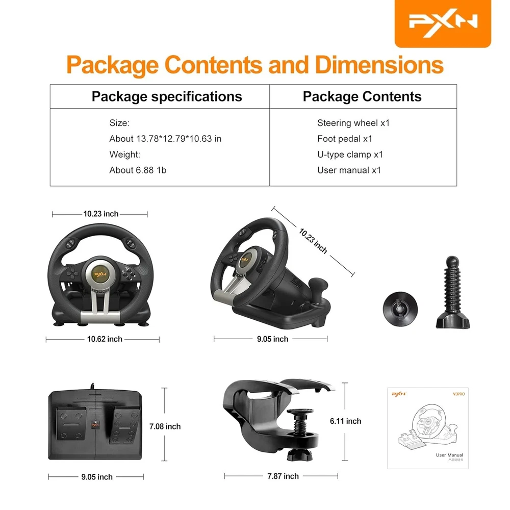Multi-Platform Gaming Steering Wheel for PS4, PC, Xbox, PS3, Racing Pedal, V3II Multi-Platform Steering Wheel: Cross-platform gaming steering wheel, compatible with PS4, PS4 Slim, PS4 Pro, PS3, PC, Xbox Series X|S, Xbox One (X input and D input). Supports almost racing games: Game Racing Wheels is suitable for almost racing games like Need for Speed, Forza Horizon, Dirt, GTA, American Truck Simulator, Euro Truck Simulator. Professional PC Steering Wheel: Built-in Dual Vibration Motors. Smart dual-core, support X input and D input on PC, plug and play. With 3 adjustable sensitivity levels (medium/high/low), it is suitable for players with different gaming experience, with programming function, it is more convenient to experience the game. Ergonomic design: Grip with rubber texture coating, rubber grip for anti-slip and better tactile feel, two paddles attached to steering wheel for shifting function, large pressure sensitive pedal for acceleration function and very responsive braking function, Powerful suction cup with U-clip, easy to fix on all styles of tables.