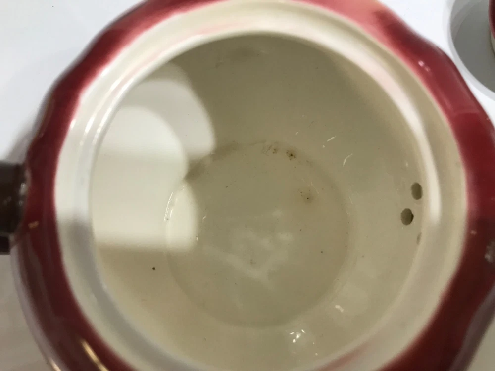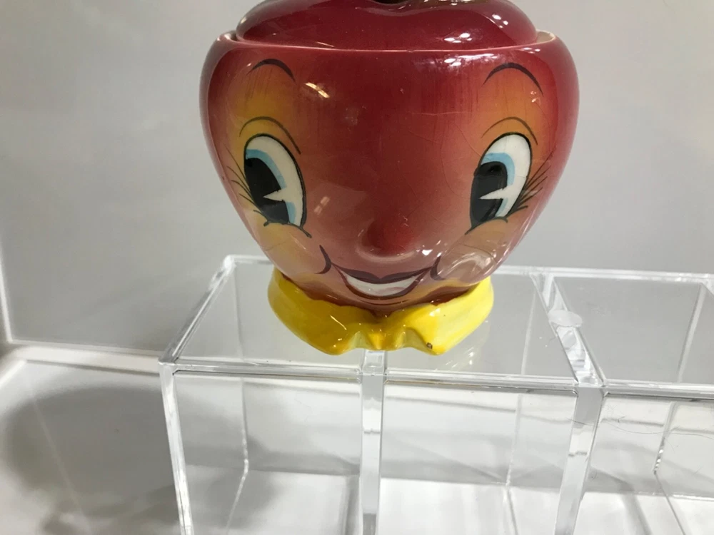 Cute smiling teapot and sugar bowl made by Py Miyao in Japan in the fifties.Teapot is excellent. No chips, cracks or repairs.The sugar bowl has 3 tiny glaze chips on yellow collar and a few tiny ones inside rim of apple.