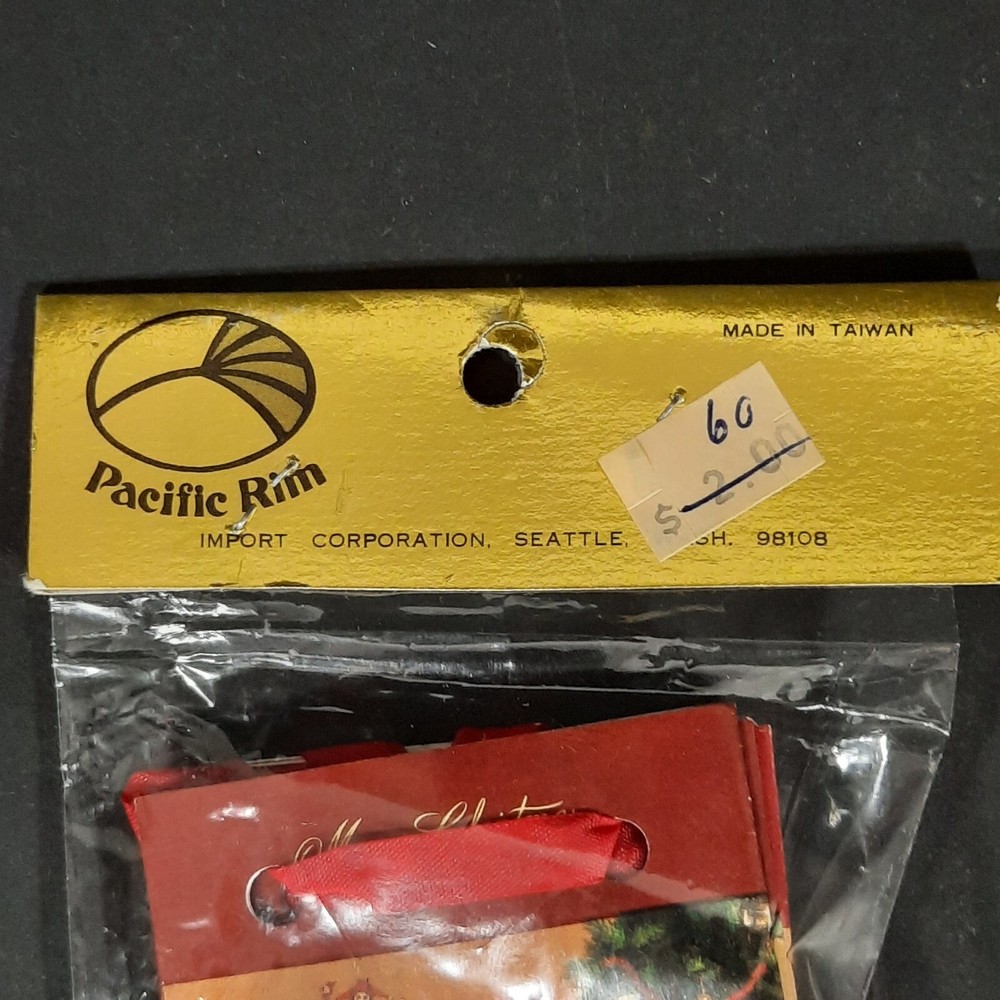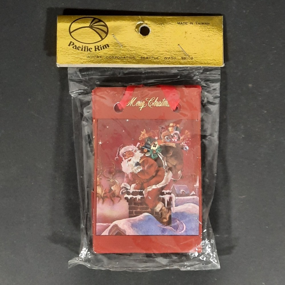 The "Pacific Rim Santa Claus Small Gift Bags" are vintage Christmas-themed gift totes featuring Santa Claus. Made of red paper, these small gift bags are perfect for Christmas presents. The bags are manufactured in Taiwan and are designed to add a festive touch to gift-giving during the holiday season. Each bag is adorned with a classic Santa Claus design, making them ideal for adding a touch of nostalgia to gift wrapping.