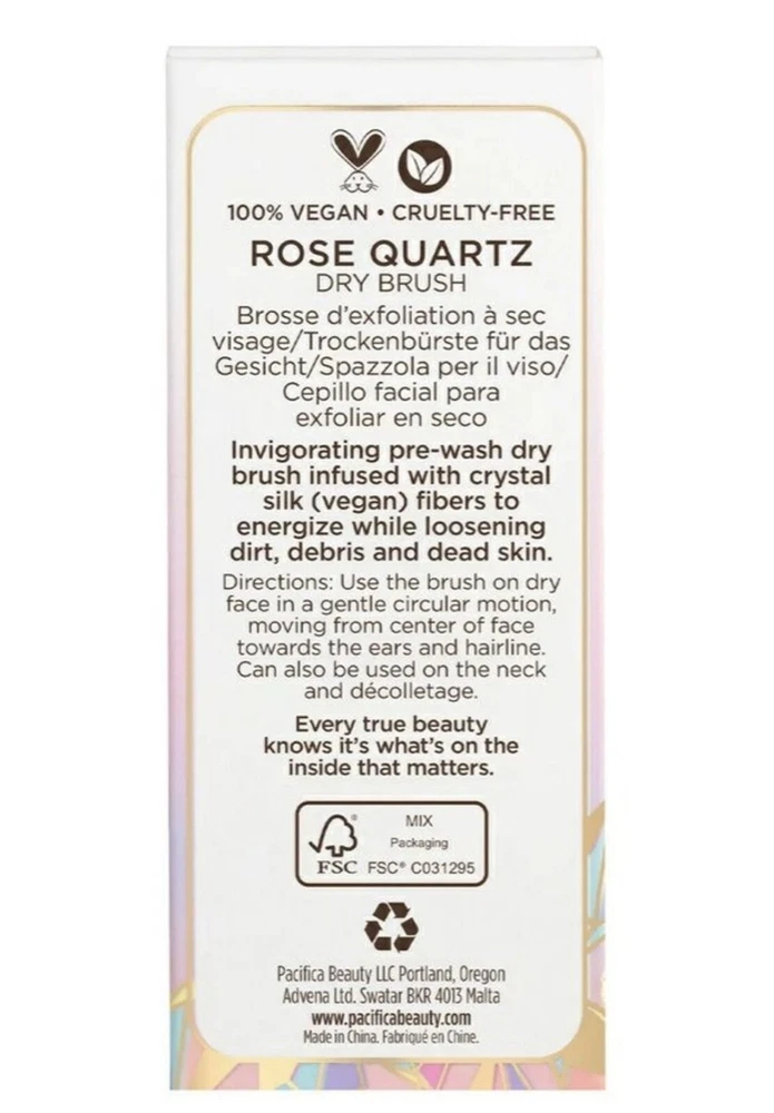 Pacifica ROSE QUARTZ Pre-Wash Dry Brush VEGAN Quartz Infused Fibers Facial Face. Brand new in box ! Pacifica Rose Quartz Pre-Wash Dry Brush What it is: The ancient ritual of dry brushing helps lift and sweep away dead skin cells for instant exfoliation. Pacifica's Rose Quartz Pre-Wash Dry Brush is infused with crystal vegan silk fibers to energize while loosening dirt, debris and dead skin. Benefits:100% VeganCruelty-free What Else You Need to Know: Use the brush on dry face in a gentle circular motion, moving from center of face towards the ears and hairline. Can also be used on the neck and décolletage. Clean your brush with warm water and soap at least once a week.