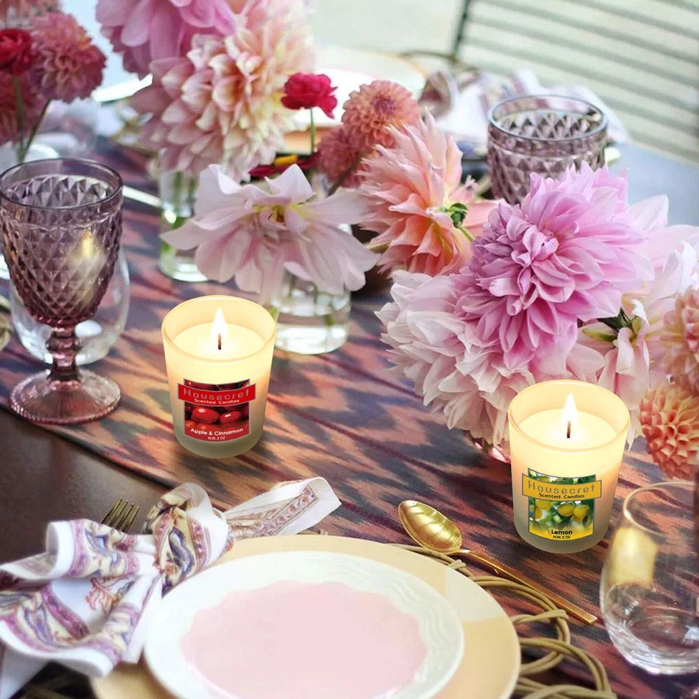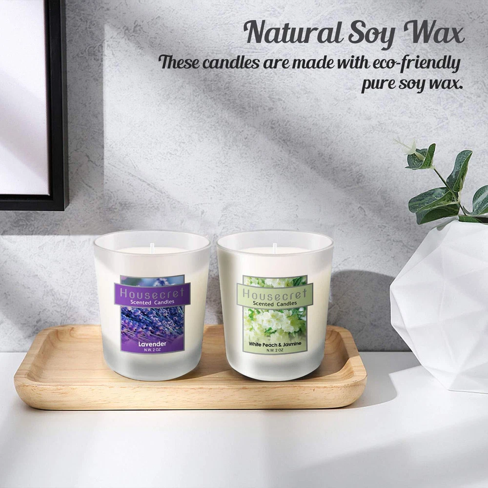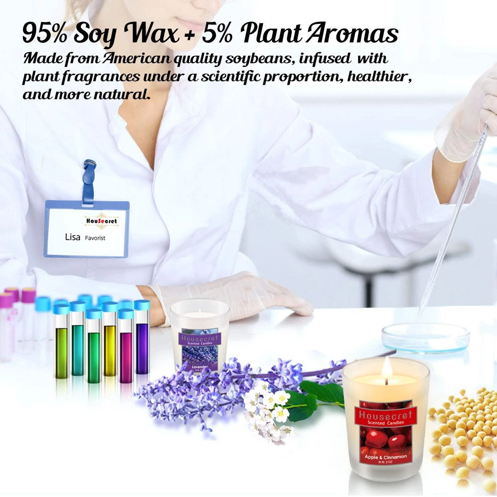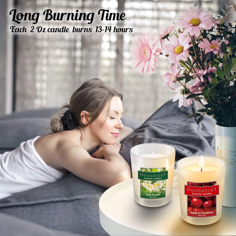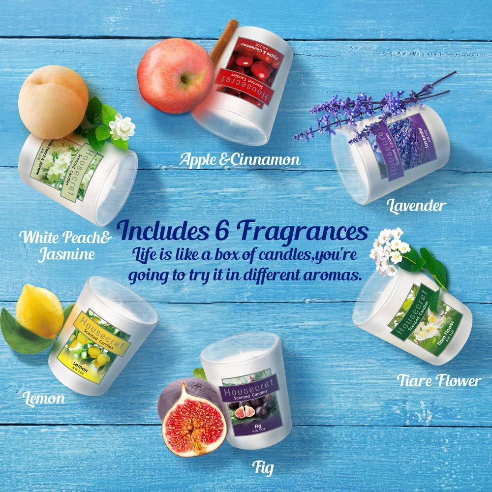 What’s in the package: 2 x Lavender Candle 2 x White Peach & Jasmine Candle 2 x Tiare Flower Candle 2 x Fig Candle 2 x Lemon Candle 2 x Apple & Cinnamon Candle CAUTION: Burning it no longer than two hours each time. Take care not to let these goods be burned on! Place it on a heat resistant surface only. NEVER near anything that can catch fire. Special Gift Set Stuck on gift ideas for your special one? Need something for the folks? Packaged in an immaculately designed box, this 12 candle set is the ideal present for Yoga, Home, Family, Women, Weddings, Birthdays, Valentine's Day, Easter, Mother's & Father's Days, Halloween, Thanksgiving, Christmas, Anniversaries, or other holidays that will delight people of all ages. Hours of Flickering Light Strike a match and light the candle to enjoy 14 hours of inviting aromas and a soft, welcoming glow. Each candle measures a generous 2 x 2.5 inches for use wherever you like. The aromatherapy candle gift set includes 6 fragrances : Lavender, White Peach & Jasmine, Tiare Flower, Fig, Lemon, Apple & Cinnamon. Each candle is 2 oz & burns for up to 14 hours. Size: Diameter 2" x Height 2.5". Environmental smokeless soy and essential oil: These candles are made with naturally biodegradable and environmental soy wax. 95% soy wax, 5% essential oil. Ideal gift set: The ideal relaxation set for Yoga, Home, Family, Women, Weddings, Birthdays, Valentine's Day, Easter, Mother's & Father's Days, Halloween, Thanksgiving, Christmas, Anniversaries, or other holidays that will delight people of all ages.