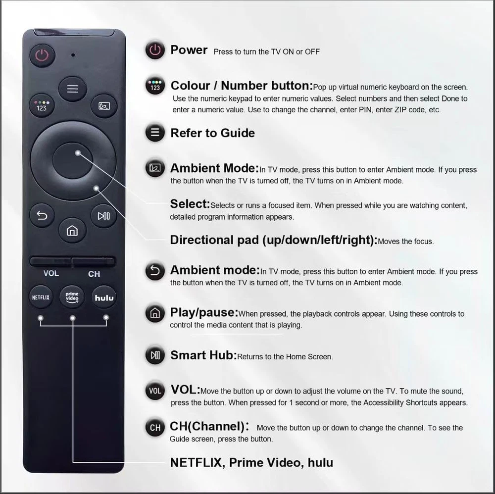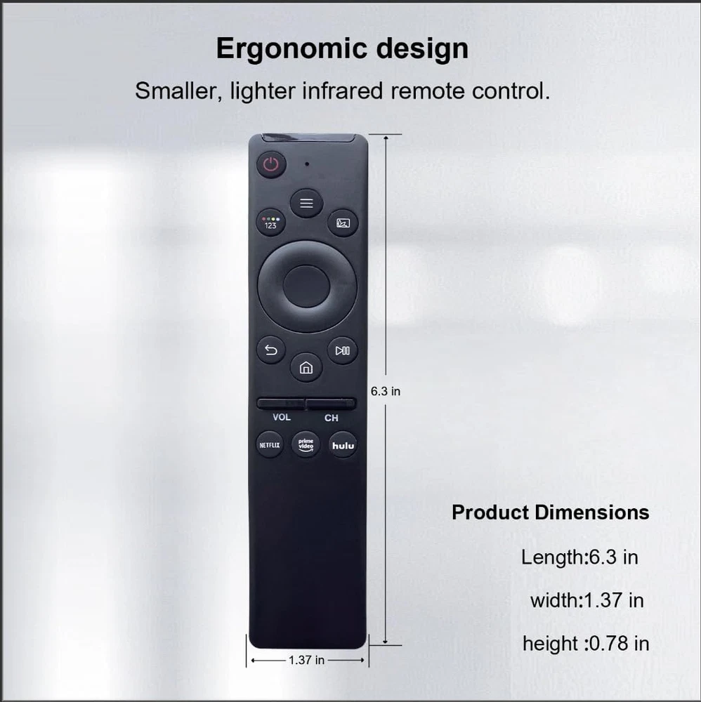 Store New Arrivals Add to Favorite View Feedback Contact Fast deliveries to the customer's home Quality customer service John Make the customers happy! 【Pack of 2】 Universal Remote-Control for Samsung Smart-Tv, Remote-Replacement of HDTV 4K UHD Curved QLED and More Tvs, with Netflix Prime-Video Hulu Buttons Description 【Pack of 2】BN59-01312A remote-control replacement for Samsung Smart LCD LED UHD QLED Smart TV, with Netflix/ Prime Video / Hulu Compatible with the samsung remote Model: BN59-01312B/H/G, BN59-01312F, BN59-01312M, BN59-01312A, BN59-01260A, BN59-01266A,BN59-01241a,BN59-01330A, etc Samsung remote models.If your TV model is not listed in our model list, please feel free to contact us before ordering, and we will help you find suitable remote control. Work for samsung 6 series,7 series,8 series, QLED Q60T Q70T Q80T series smart TV.such as RU9000 -TU8000 -TU8300 -Q60T - Q70T -Q80T -Q90T -Q800T -Q900TS -Q950TS -RU8000 -Q50 -Q60 -Q70 -Q80 -Q900 -NU8000 -NU8500 -Q6F -Q7F -Q7C -Q8F -Q9F Series etc Simple and Easy: The simple design and ease of use of this IR remote. Not a lot of small buttons and numbers all over the remote. No need to program or set anything up. Just add 2 AA batteries and go! Product Description Universal remote control for samsung smart tv Compatible Remote Models:Such as BN59-01312A, BN59-01312G, BN59-01301A, BN59-01259B, BN59-01330A, BN59-01260A, BN59-01267A, BN59-01292A, BN59-01298H, BN59-01241A, BN59-01178W, BN59-01289A, BN59-01266A, BN59-01220E,BN59-1301A,BN59-1315A,and others Substitute for Samsung 6 series, 7 series, 8 series, QLED Q60T Q70T Q80T series smart TVs. Such as: RU7100 - RU8000 - RU9000- TU8000 - TU8200 - TU8300- Q60T- Q70T- Q80T - Q90T - Q800T - Q900TS - Q950TS - LST7 - LS05- Q50 - Q60 - Q70 - Q80 - Q90 - Q900 - MU6300 - MU7000 - NU8000 - NU8500 - Q6F - Q7F - Q7C - Q8F - Q9F series and more. Not a lot of small buttons and numbers all over the remote. It's small and easy to handle. Great replacement for bulky tv remote. Suitable for Samsung TV: 2020 TV TU-8000 Series UN45TU8000FXZA, UN50TU8000FXZA, UN55TU8000FXZA, UN65TU8000FXZA, UN75TU8000FXZA, UN85TU8000FXZA QLED Q60T Series QN50Q60TAFXZA QN55Q60TAFXZA QN58Q60TAFXZA QN65Q60TAFXZA QN75Q60TAFXZA QN82Q60TAFXZA QLED Q70T Series QN55Q70TAFXZA QN65Q70TAFXZA QN75Q70TAFXZA QN82Q70TAFXZA QN85Q70TAFXZA QLED Q80T Series QN49Q80TAFXZA, QN50Q80TAFXZA, QN55Q80TAFXZA, QN65Q80TAFXZA, QN75Q80TAFXZA, QN85Q80TAFXZA QLED Q90T Series QN55Q90TAFXZA, QN65Q90TAFXZA, QN75Q90TAFXZA, QN85Q90TAFXZA QLED Q800T Series QN65Q800TAFXZA, QN75Q800TAFXZA, QN82Q800TAFXZA QLED 8K Q900 Series QN65Q900TSAFXZA, QN75Q900TSAFXZA, QN85Q900TSAFXZA Compatible with BN59-1312A BN59-1312B BN59-1312G BN59-1312F BN59-1312H BN59-1315A Suitable for Samsung TV: 2019 TV RU8000 Series: UN49RU8000FXZA, UN55RU8000FXZA, UN65RU8000FXZA, UN75RU8000FXZA, UN82RU8000FXZA Q50 Series: QN32Q50RAFXZA Q60 Series: QN43Q60RAFXZA, QN49Q60RAFXZA, QN55Q60RAFXZA, QN65Q60RAFXZA, QN75Q60RAFXZA, QN82Q60RAFXZA Q70 Series: QN49Q70RAFXZA, QN55Q70RAFXZA, QN65Q70RAFXZA, QN75Q70RAFXZA, QN82Q70RAFXZA, QN85Q70RAFXZA Q80 Series: QN55Q80RAFXZA, QN65Q80RAFXZA, QN75Q80RAFXZA, QN82Q80RAFXZA Q900 Series: QN55Q900RBFXZA, QN65Q900RBFXZA, QN75Q900RBFXZA, QN82Q900RBFXZA Compatible with:BN59-1259B BN59-1259D BN59-1259E BN59-1260A BN59-1292A 1266A BN59-1274A BN59-1241A BN59-1260A BN59-1278A Suitable for Samsung TV: 2018 TV NU8000 Series: UN49NU8000FXZA, UN55NU8000FXZA, UN65NU8000FXZA, UN75NU8000FXZA, UN82NU8000FXZA NU8500 Curved Series: UN55NU8500FXZA, UN65NU8500FXZA NU7300 Curved Series: UN55NU7300FXZA, UN65NU7300FXZA Q6F Series: QN65Q6FNAFXZA, QN75Q6FNAFXZA Q7F Series: QN55Q7FNAFXZA, QN65Q7FNAFXZA, QN75Q7FNAFXZA Q7C Series: QN55Q7CNAFXZA, QN65Q7CNAFXZA Q8F Series: QN55Q8FNBFXZA, QN65Q8FNBFXZA, QN75Q8FNBFXZA Q9F Series: QN65Q9FNAFXZA, QN75Q9FNAFXZA 2017 Series tv models: MU8500 Series: UN65MU8500FXZA MU9000 Series: UN65MU9000FXZA, UN55MU9000FXZA, UN65MU9000FXZA, UN75MU9000FXZAMU6300 Series: UN40MU6300FXZA, UN43MU6300FXZA, UN50MU6300FXZA, UN55MU6300FXZA, UN65MU6300FXZA, UN75MU6300FXZA MU6500 Series: UN49MU6500FXZA, UN55MU6500FXZA, UN65MU6500FXZA MU7000 Series: UN40MU7000FXZA, UN49MU7000FXZA, UN55MU7000FXZA, UN65MU7000FXZA MU7500 Series: UN49MU7500FXZA, UN55MU7500FXZA, UN65MU7500FXZA MU8000 Series: UN49MU8000FXZA, UN55MU8000FXZA, UN65MU8000FXZA, UN75MU8000FXZA, UN82MU8000FXZA MU8500 Series: UN65MU8500FXZA MU9000 Series: UN65MU9000FXZA, UN55MU9000FXZA, UN65MU9000FXZA, UN75MU9000FXZA Item Weight 3.52 ounces Product Dimensions 2.48 x 0.54 x 1.57 inches Batteries 2 AA batteries required. Compatible Devices Television Max Number of Supported Devices 1 Connectivity Technology Infrared Special Feature Universal Size BN59-1301 ABOUT US We offer the best prices around on high quality products. Our E-store includes media such as books, movies, music and games while offering electronics, toys, sporting apparel, clothing, tools, general home, garden items and more. SHIPPING We are always working hard to ensure your package arrives as soon as possible. Please understand that some factors like weather, high postal traffic, and the performance of shipping companies are outside of our control. We offer free shipping to the lower 48 states and ship within 2 business days of payment, usually sooner. We do not accept P.O. Boxes. Please provide a physical address. For shipping outside of the continental USA, we only use eBay's Global Shipping Program. The item is shipped to KY and then sent to the rest of the world. International customers are responsible for all duties and taxes. Continue to 'check out' to calculate costs for shipping the item to your country. Messages regarding eBay's Global Shipping Program MUST be directed at eBay EXCLUSIVELY. RETURNS We offer a 30-Day Return Policy on items in which you are not completely satisfied with. You have the option of a full-refund or an exchange of the item. No returns are available on items shipped outside of the USA PAYMENT We accept PayPal. CONTACT US