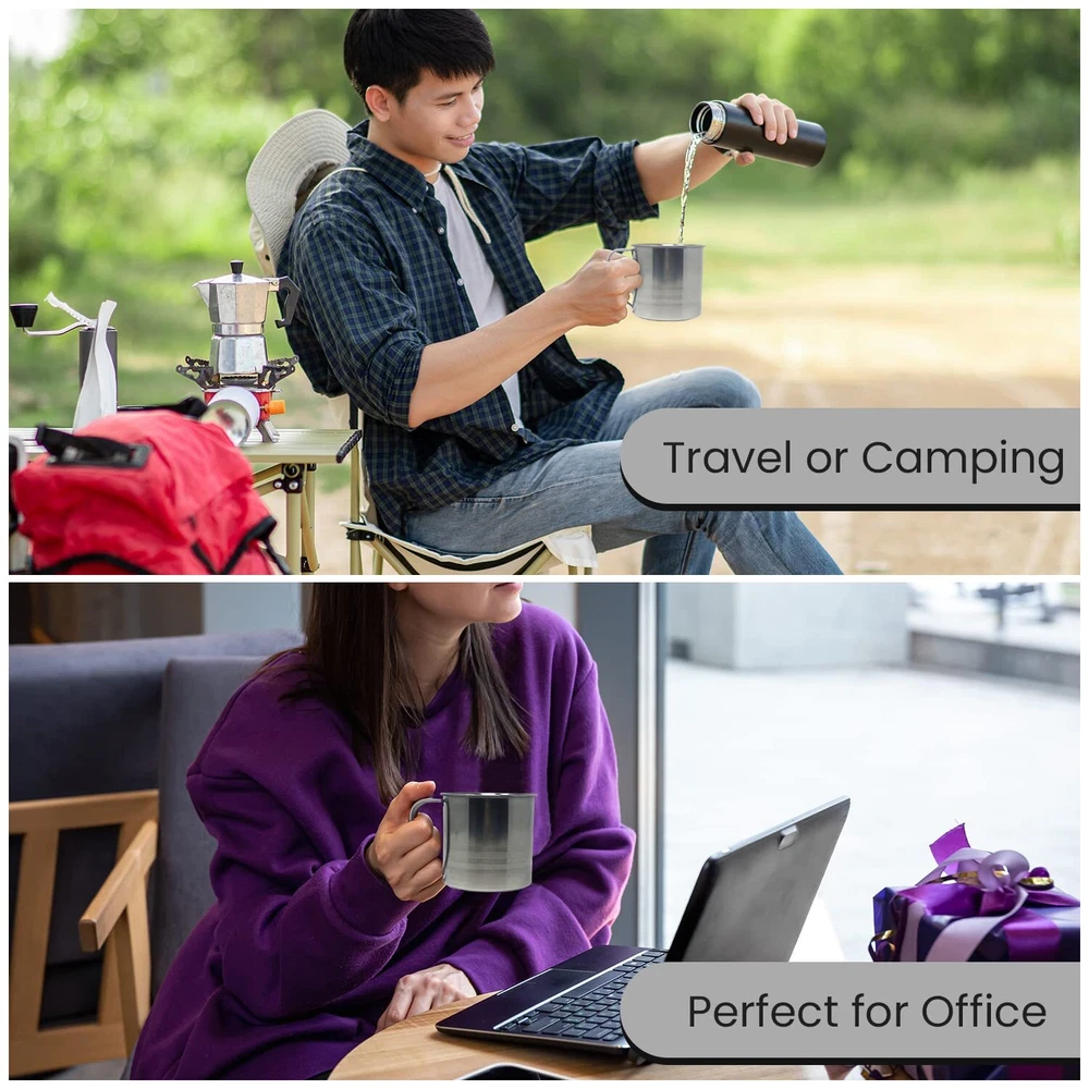 Value 6 Pack-Light Weight Sturdy 12-oz Drinking Cup with Rolled Edge. VALUE 6-PACK: DRINKING CUPS 12 OZ. each LIGHTWEIGHT: rust resistant steel COLD BEVERAGES: like tea, lemonade, orange juice ect. much more refreshing Sturdy yet lightweight cups/mugs ideal for cooking over a fire, collecting water or enjoying a hot or cold beverage. Measurements: top diameter 3.4", height 2.7"