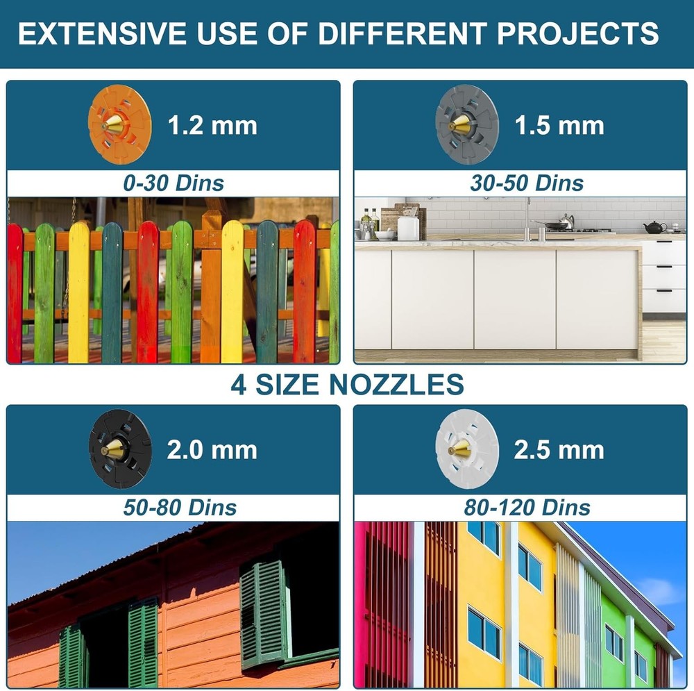 Paint Sprayer, 700W HVLP Spray Gun with 4 Nozzles & 3 Patterns, Blue Product Details Brand: WIBENTL Tank Volume: 1.2E+3 Milliliters Color: Blue Recommended Uses For Product: Painting Material: Brass Product Dimensions: 5.9"W x 11.1"H Style: Handheld Gun Power Source: ac Included Components: Paint Sprayer, Container, Brass Nozzles, Cleaning Needle, Cleaning Brush, Viscosity Cup, Filter, User Manual Model Name: WG20A Manufacturer: WIBENTL Part Number: WG20A Item Weight: 3.96 pounds Item model number: WG20A Special Features: Portable, Low Pressure, High Volume Batteries Included?: No Batteries Required?: No Brand: WIBENTL Tank Volume: 1.2E+3 Milliliters Color: Blue Recommended Uses For Product: Painting Material: Brass 【4 Nozzle Sizes and 3 Spray Patterns】WIBENTL 700W paint sprayer can be adjusted to 3 different spray patterns: horizontal, vertical and circular, and is equipped with 4 sizes of nozzles (1.2mm, 1.5mm, 2.0mm, 2.5mm ), suitable for a variety of spraying projects, such as furniture, cabinets, doors, walls, garden chairs, etc 【Adjustable spray width and flow control】Say goodbye to overspray and paint waste. The WIBENTL portable paint sprayer features an adjustable spray width knob that allows you to precisely manage the spraying area and optimize paint usage for various projects. In addition, the flow control knob allows you to easily adjust the paint flow to meet a variety of spraying needs, achieve better spraying results, and have greater flexibility 【Package Contents】1 X Paint Sprayer, 1 X 1200ml Container, 4 X Brass Nozzles, 1 X Cleaning Needle, 1 X Cleaning Brush, 1 X Viscosity Cup, 1 X Lid Pot, 1 X Filter, 5X Paper Funnel, 1 X User Manual 【Easy to Use & Clean】This paint sprayer can be assembled effortlessly without the need for any tools. Even if you're a beginner, you can start using it with ease after reading the manual. It comes with a cleaning brush and a needle to remove any hardened paint left in the nozzle, making it convenient and efficient for you to clean