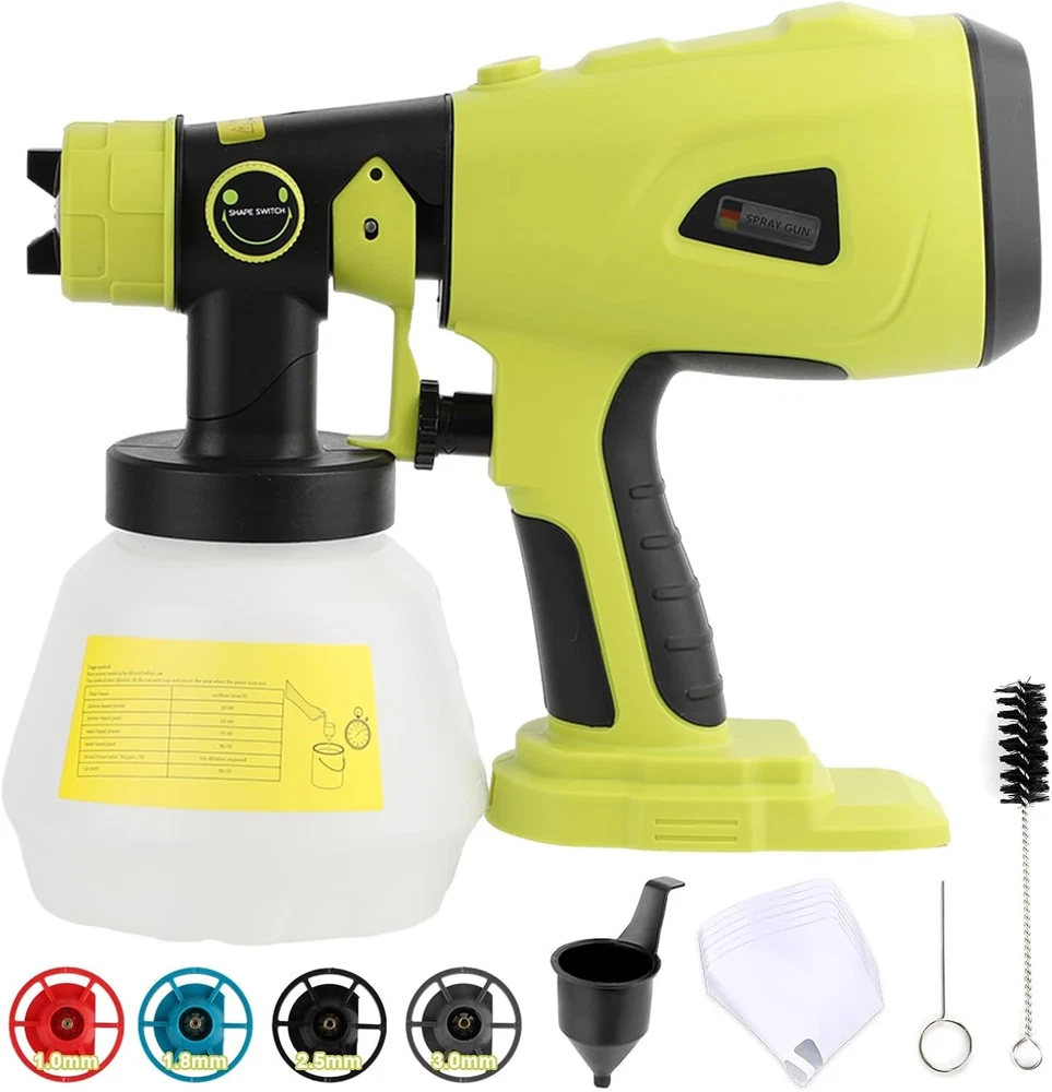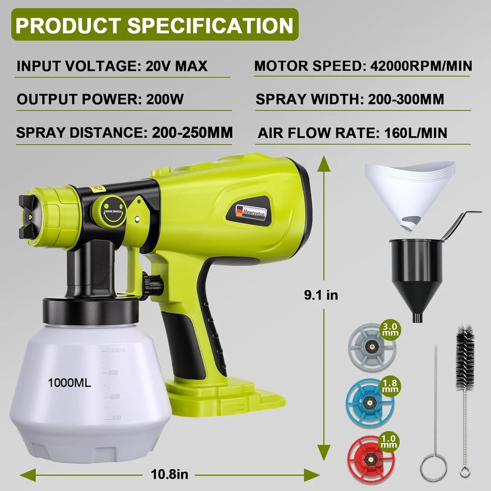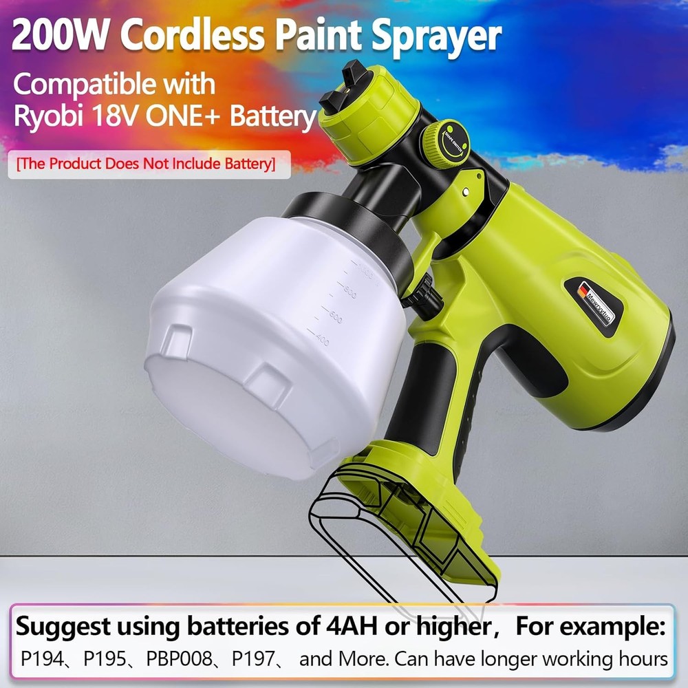 Paint Sprayer Cordless Spray Paint Gun for Ryobi 18V MAX Battery, 200W Electric Spray Gun with 4 Size Nozzles for House Painting, Fence Chairs & Furniture Painting [ Battery Not Included ] Paint Sprayer Cordless Spray Paint Gun for Ryobi 18V MAX Battery, 200W Electric Spray Gun with 4 Size Nozzles for House Painting Cordless Paint Sprayer Gun Ship from US local warehouse Ship within 24 hours, fast delivery 100% Professional technical inspection before delivery Ship with traceable tracking number Paint Sprayer Cordless Spray Paint Gun for Ryobi 18V MAX Battery, 200W Electric Spray Gun with 4 Size Nozzles for House Painting, Fence Chairs & Furniture Painting [ Battery Not Included ] Note: Please read this instruction manual carefully before using the tool. Note: Paint primer needs to be diluted before use Test method after diluted: fill the viscosity cup and count the time when the paint runs out. Color: Green Material: Plastic About this item Our Paint Sprayer Cordless Spray Paint Gun for Ryobi 18V MAX Battery – Easily power your paint sprayer with your existing 18V MAX series batteries. — work cordlessly and efficiently anywhere indoors or outdoors. ✅ 【200W High Power Paint Sprayer with Adjustable Nozzle】- 200W high-power motor (42,000 RPM), 160L/min airflow, sprays 200-250mm away with adjustable width of 200-300mm for smooth, controlled coverage. ✅ 【Paint Sprayer with Adjustable Spraying Width】- Equipped with spraying width adjustment knob – just turn it left or right to easily switch the spraying mode between 200-300mm. ✅ 【Spray Paint Gun with Rotatable Nozzle】- The adjustable rotating nozzle can flexibly adjust the spraying angle and direction, especially suitable for edges, corners and delicate work. ✅ 【Cordless Paint Sprayer with Copper Nozzle Valve Core】 – This paint sprayer uses a high-quality all-copper valve core nozzle to ensure excellent atomization effect, create a fine and even coating, and minimize overspray. ✅ 【Advanced Atomization and Flow Control】—Equipped with adjustable flow and atomization control valve, you can fine-tune the paint flow and mist particle size. Easily switch between fine mist and wide-angle spraying. Product Description Our Paint Sprayer Cordless Spray Paint Gun for Ryobi 18V MAX Battery, [ battery not included ]. Powered by a 200W motor (42,000 RPM), it delivers fast, smooth, and professional results with adjustable features for total control. Key Features: 1、Adjustable Spray Width (200-300mm) – Easily change coverage with the rotary control knob; 2、Rotatable Nozzle – Flexible 360° rotation for multi-angle, detailed spraying; 3、Copper Nozzle Core – High-quality full copper construction ensures superior atomization & smooth finish; 4、Advanced Flow & Atomization Control – Fine-tune paint output and mist particle size with the adjustable valve Perfect for furniture, fences, walls, decks, and DIY projects. Lightweight, portable, and easy to clean. Packge Included: 1 x Paint Sprayer Gun(Battery not included) 3 x Replacement Nozzles(1.0/1.8/2.5/3.0mm) 1 x Paint Measuring Cup 6 x Paint Filter 1 x Cleaning Brush 1 x Clogging Needle 30 x Protective Gloves 1 x User Manual Product Description The 200W spray gun can generate stronger spraying force,cover the surface of objects faster.1000ml large capacity can paint 3-5 per square meter at one time. Payment Shipping Policy Returns & Warranty About us Contact us Payment *All payments must be prepaid. *We only accept payment via Paypal. Please kindly check if you can do the payment via PayPal before placing an order. Shipping Policy *We are not responsible for undeliverable address. We reserve the right to charge the shipping fee again for returned items due to wrong address. *Items are generally shipped out the next business day after your payment has been cleared (Sat. & Sun. excluded.) *Orders from the United States will all be shipped out via UPS/USPS. The shipment usually takes 3-5 business days( Saturday and Sunday excluded), if you need the item urgently, please contact us for detail before purchase. *Local pick up is not available. *NO International Shipping, including Canada. Returns & Warranty *This product has a 5-year warranty. *Our warranty does not extended to any products that are physically damaged or that are not under normal operating conditions as a result of misuse or improper installation on the buyer/user's part. *For all returned products, buyers MUST contact us for the returning address. *In all cases, buyers pay shipping fees at their own cost to return products for exchange or refund. We will be responsible for the postage of replacements. Refund will be made upon receipt of the returned item. About us *We focus on designing and manufacturing varieties of Power Tool batteries with high quality and competitive price.We will do our best to serve you! Contact us *We have always been trying our best to provide the best service and reliable products for every customer. Please contact us via eBay message or email to resolve the issue before leaving negative feedback. *Any problems pls contact us at any time before leaving a negative/neutral feedback. Many thanks to you.