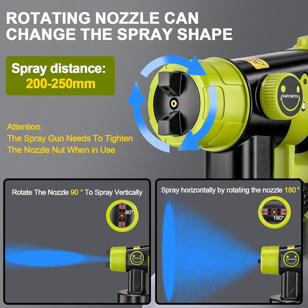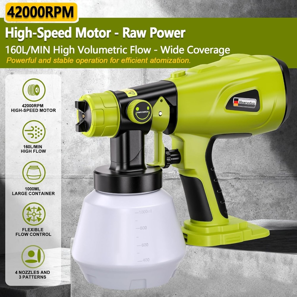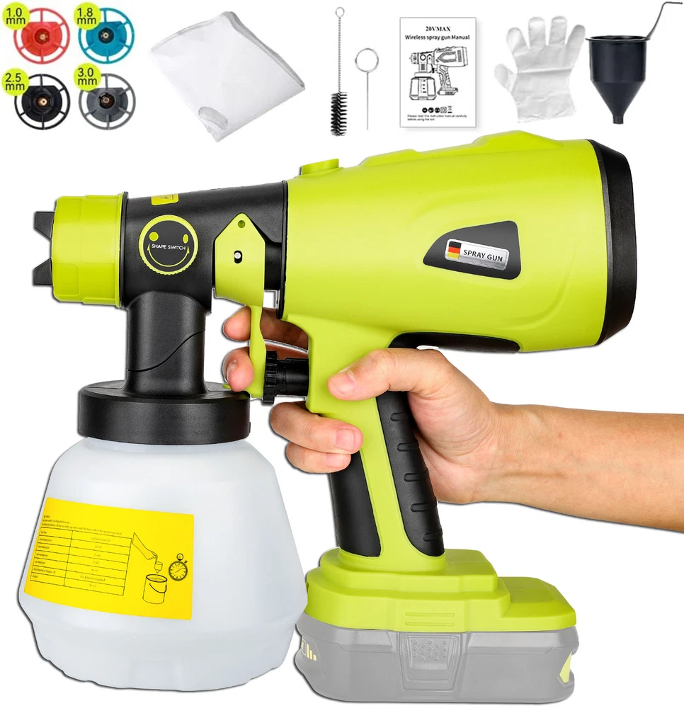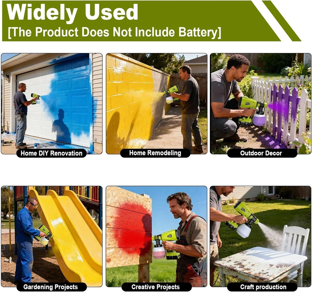 Paint Sprayer Cordless Spray Paint Gun for Ryobi 18V MAX Battery, 200W Electric Spray Gun with 4 Size Nozzles for House Painting, Fence Chairs & Furniture Painting [ Battery Not Included ] Paint Sprayer Cordless Spray Paint Gun for Ryobi 18V MAX Battery, 200W Electric Spray Gun with 4 Size Nozzles for House Painting Cordless Paint Sprayer Gun Ship from US local warehouse Ship within 24 hours, fast delivery 100% Professional technical inspection before delivery Ship with traceable tracking number Paint Sprayer Cordless Spray Paint Gun for Ryobi 18V MAX Battery, 200W Electric Spray Gun with 4 Size Nozzles for House Painting, Fence Chairs & Furniture Painting [ Battery Not Included ] Note: Please read this instruction manual carefully before using the tool. Note: Paint primer needs to be diluted before use Test method after diluted: fill the viscosity cup and count the time when the paint runs out. Color: Green Material: Plastic About this item Our Paint Sprayer Cordless Spray Paint Gun for Ryobi 18V MAX Battery – Easily power your paint sprayer with your existing 18V MAX series batteries. — work cordlessly and efficiently anywhere indoors or outdoors. ✅ 【200W High Power Paint Sprayer with Adjustable Nozzle】- 200W high-power motor (42,000 RPM), 160L/min airflow, sprays 200-250mm away with adjustable width of 200-300mm for smooth, controlled coverage. ✅ 【Paint Sprayer with Adjustable Spraying Width】- Equipped with spraying width adjustment knob – just turn it left or right to easily switch the spraying mode between 200-300mm. ✅ 【Spray Paint Gun with Rotatable Nozzle】- The adjustable rotating nozzle can flexibly adjust the spraying angle and direction, especially suitable for edges, corners and delicate work. ✅ 【Cordless Paint Sprayer with Copper Nozzle Valve Core】 – This paint sprayer uses a high-quality all-copper valve core nozzle to ensure excellent atomization effect, create a fine and even coating, and minimize overspray. ✅ 【Advanced Atomization and Flow Control】—Equipped with adjustable flow and atomization control valve, you can fine-tune the paint flow and mist particle size. Easily switch between fine mist and wide-angle spraying. Product Description Our Paint Sprayer Cordless Spray Paint Gun for Ryobi 18V MAX Battery, [ battery not included ]. Powered by a 200W motor (42,000 RPM), it delivers fast, smooth, and professional results with adjustable features for total control. Key Features: 1、Adjustable Spray Width (200-300mm) – Easily change coverage with the rotary control knob; 2、Rotatable Nozzle – Flexible 360° rotation for multi-angle, detailed spraying; 3、Copper Nozzle Core – High-quality full copper construction ensures superior atomization & smooth finish; 4、Advanced Flow & Atomization Control – Fine-tune paint output and mist particle size with the adjustable valve Perfect for furniture, fences, walls, decks, and DIY projects. Lightweight, portable, and easy to clean. Packge Included: 1 x Paint Sprayer Gun(Battery not included) 3 x Replacement Nozzles(1.0/1.8/2.5/3.0mm) 1 x Paint Measuring Cup 6 x Paint Filter 1 x Cleaning Brush 1 x Clogging Needle 30 x Protective Gloves 1 x User Manual Product Description The 200W spray gun can generate stronger spraying force,cover the surface of objects faster.1000ml large capacity can paint 3-5 per square meter at one time. Payment Shipping Policy Returns & Warranty About us Contact us Payment *All payments must be prepaid. *We only accept payment via Paypal. Please kindly check if you can do the payment via PayPal before placing an order. Shipping Policy *We are not responsible for undeliverable address. We reserve the right to charge the shipping fee again for returned items due to wrong address. *Items are generally shipped out the next business day after your payment has been cleared (Sat. & Sun. excluded.) *Orders from the United States will all be shipped out via UPS/USPS. The shipment usually takes 3-5 business days( Saturday and Sunday excluded), if you need the item urgently, please contact us for detail before purchase. *Local pick up is not available. *NO International Shipping, including Canada. Returns & Warranty *This product has a 5-year warranty. *Our warranty does not extended to any products that are physically damaged or that are not under normal operating conditions as a result of misuse or improper installation on the buyer/user's part. *For all returned products, buyers MUST contact us for the returning address. *In all cases, buyers pay shipping fees at their own cost to return products for exchange or refund. We will be responsible for the postage of replacements. Refund will be made upon receipt of the returned item. About us *We focus on designing and manufacturing varieties of Power Tool batteries with high quality and competitive price.We will do our best to serve you! Contact us *We have always been trying our best to provide the best service and reliable products for every customer. Please contact us via eBay message or email to resolve the issue before leaving negative feedback. *Any problems pls contact us at any time before leaving a negative/neutral feedback. Many thanks to you.