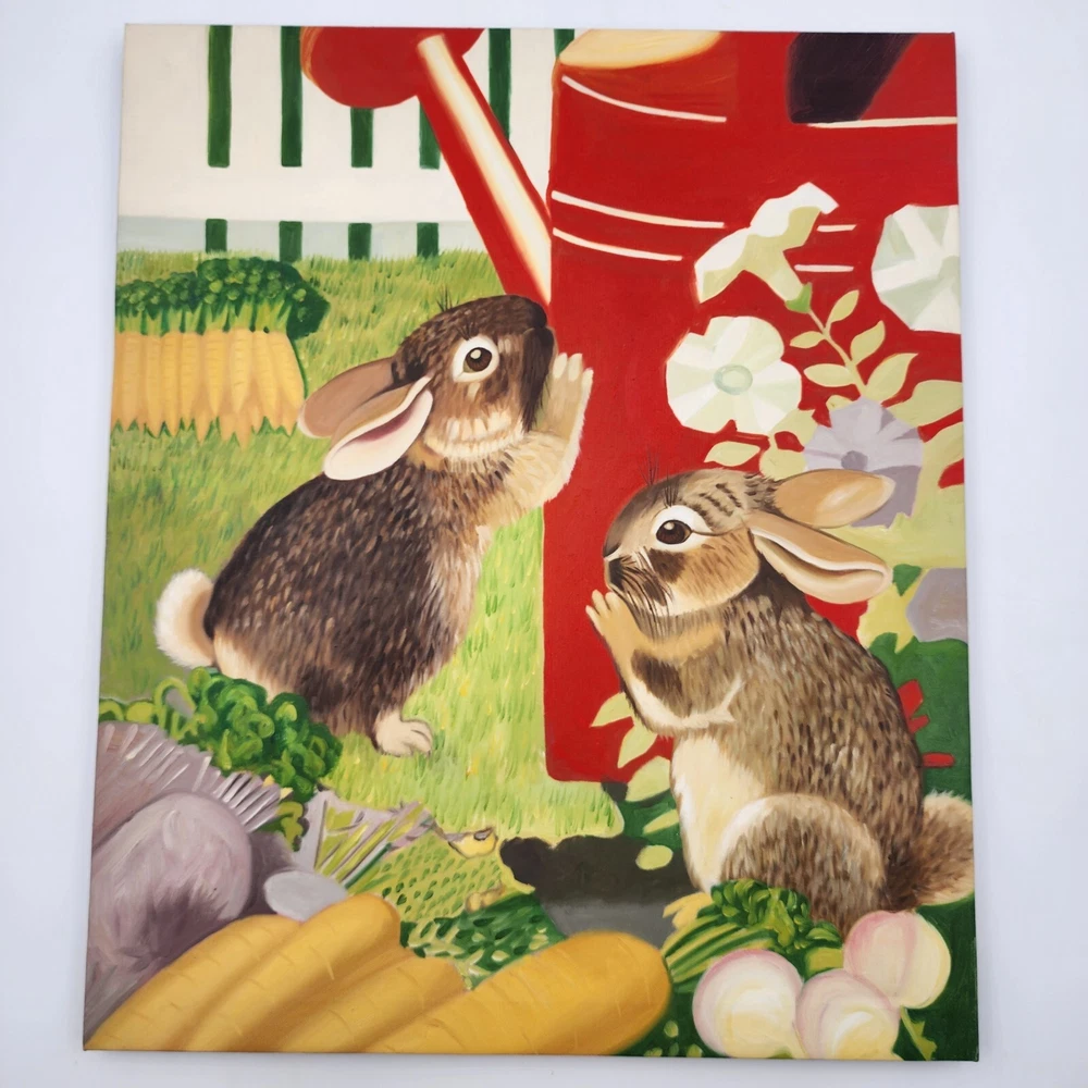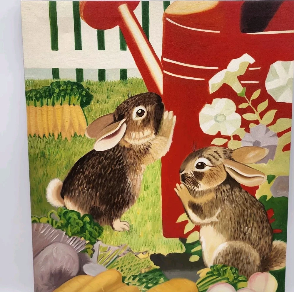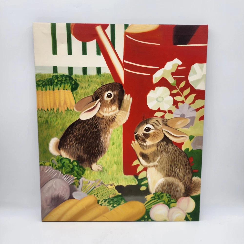 Painting Print Wall Hanging Art On Canvas Rabbits Bunnies Easter Spring 20"x24". Condition is Used. Shipped with Economy Shipping.