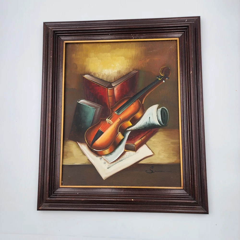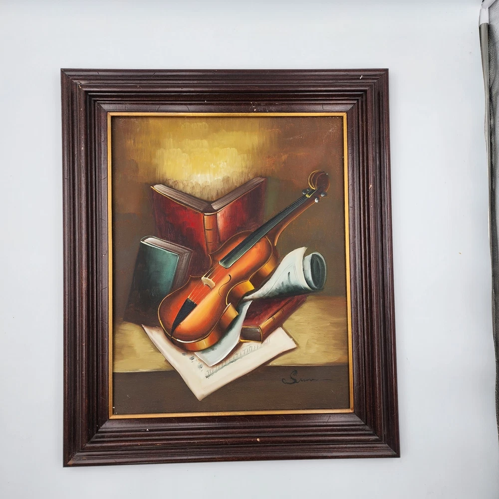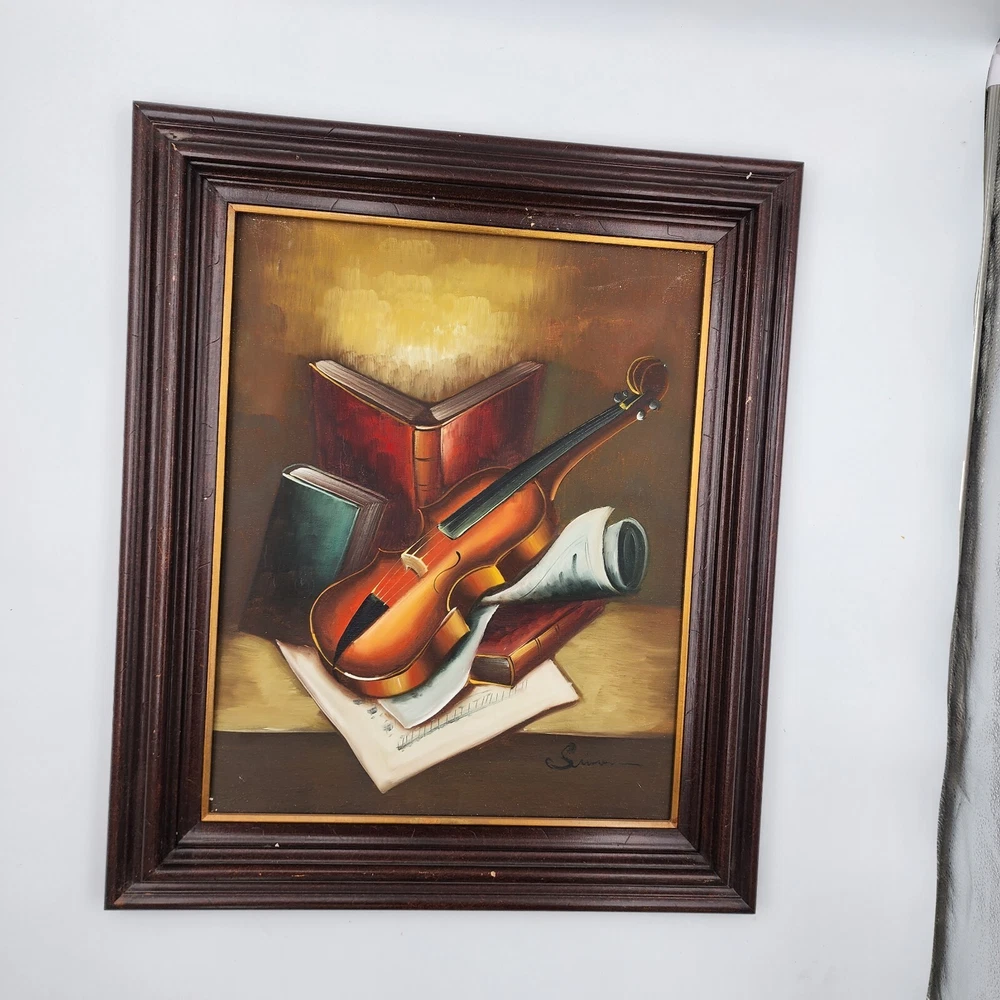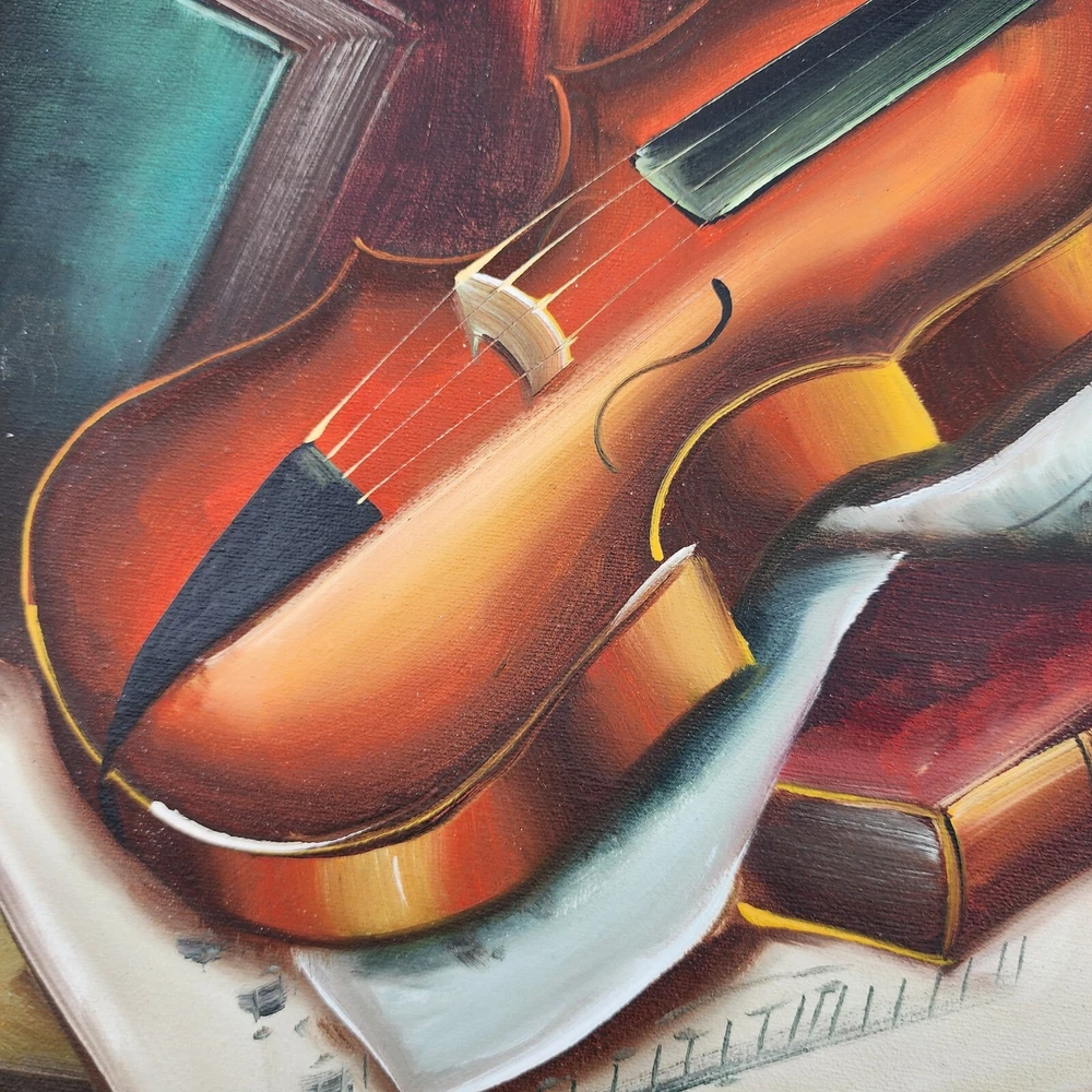 This still life painting of a violin, books, and music sheets celebrates the art of music. Still life imagery of this particular subject matter has been common throughout history. What is unique to this picture is the appearance of multiple perspectives. Each object appears to be on its own plane. This is a modernist technique applied to a very traditional subject matter. Even the backlight and glow has very traditional roots in art history. It is a well done piece by an artist. Framed, this signed work measures 22”x26"x2.5."