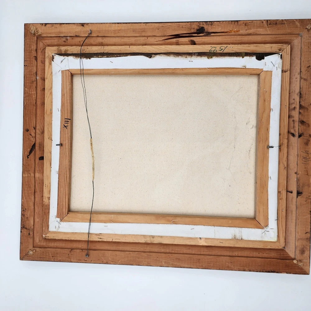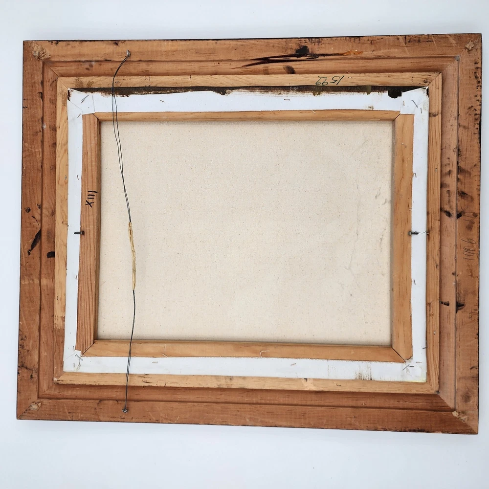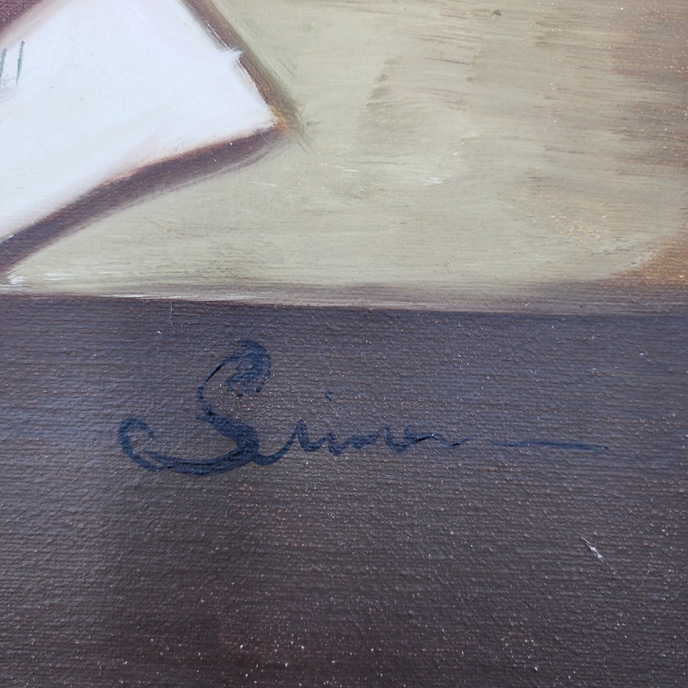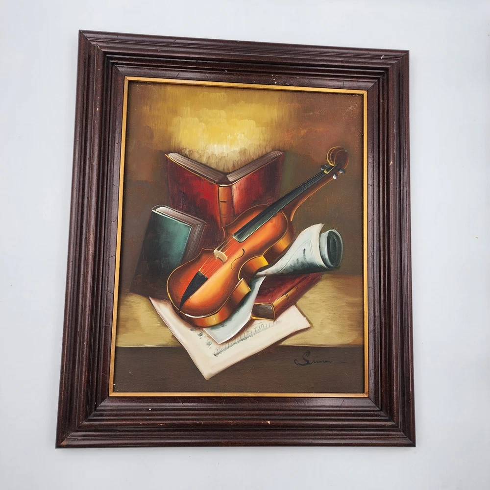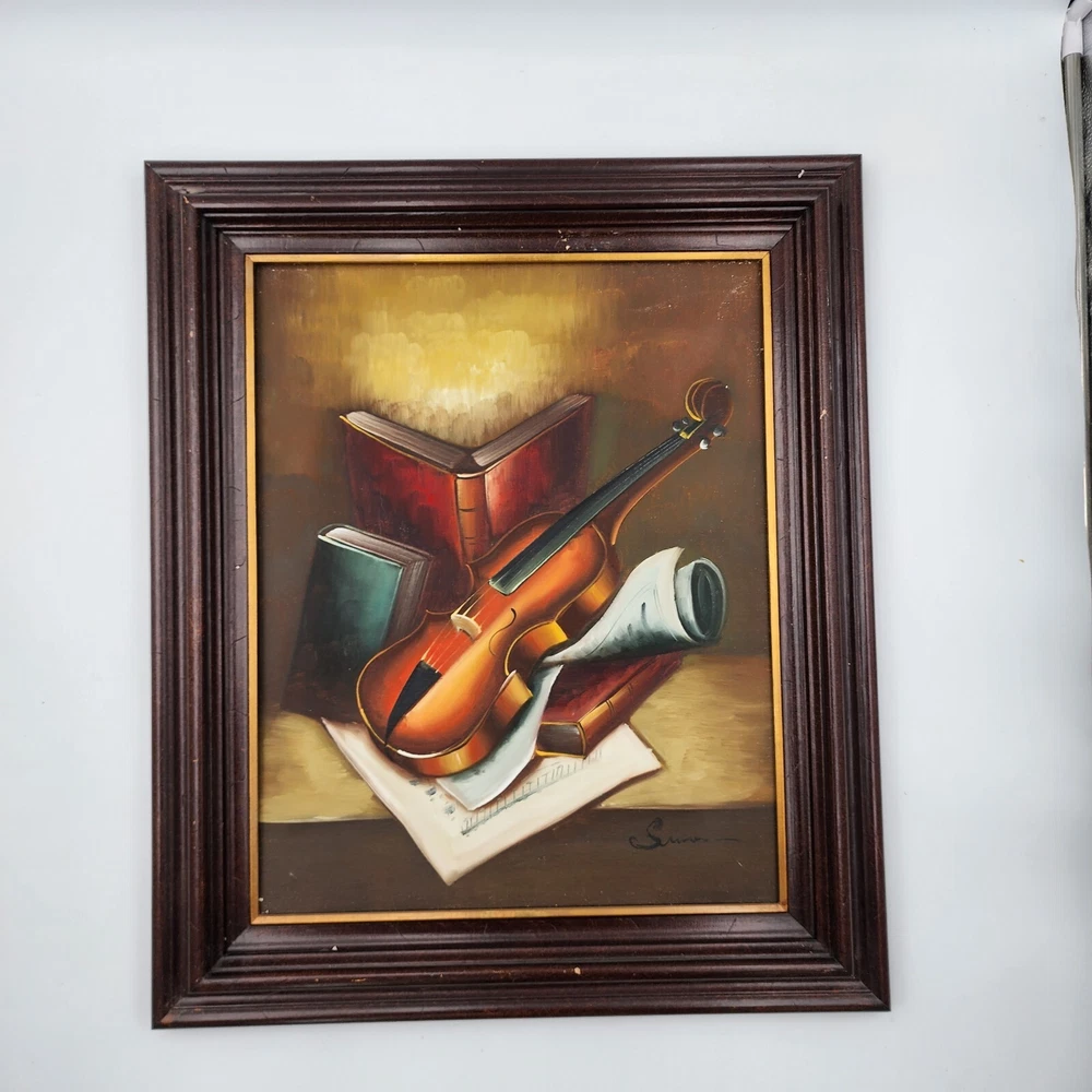 This still life painting of a violin, books, and music sheets celebrates the art of music. Still life imagery of this particular subject matter has been common throughout history. What is unique to this picture is the appearance of multiple perspectives. Each object appears to be on its own plane. This is a modernist technique applied to a very traditional subject matter. Even the backlight and glow has very traditional roots in art history. It is a well done piece by an artist. Framed, this signed work measures 22”x26"x2.5."