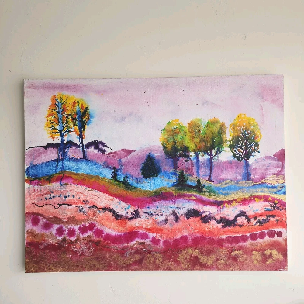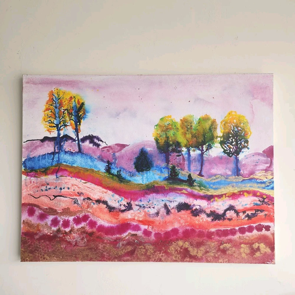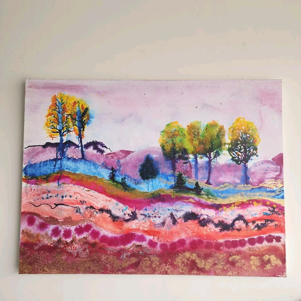 This contemporary watercolor painting is quite large, measuring 40"x30"x2." The painting is stretched around the sides and therefore does not need to be framed. This painting is unsigned, and the artist is unknown. The imagery is that of a landscape filled with trees in a rainbow of bright colors. Wavey lines represent changes in elevation both in the foreground and behind the trees. Touches of gold have been strategically placed throughout the picture to add highlights. This modern piece can cover a large wall and offer a burst of color; perfect for breaking up the monotony of an otherwise bare wall.