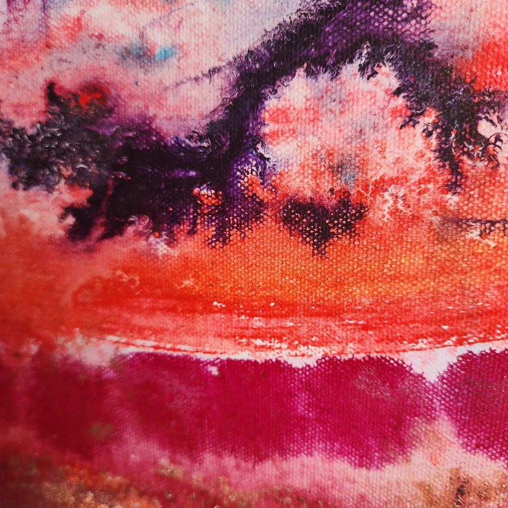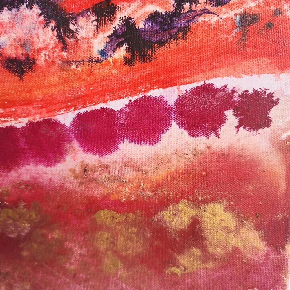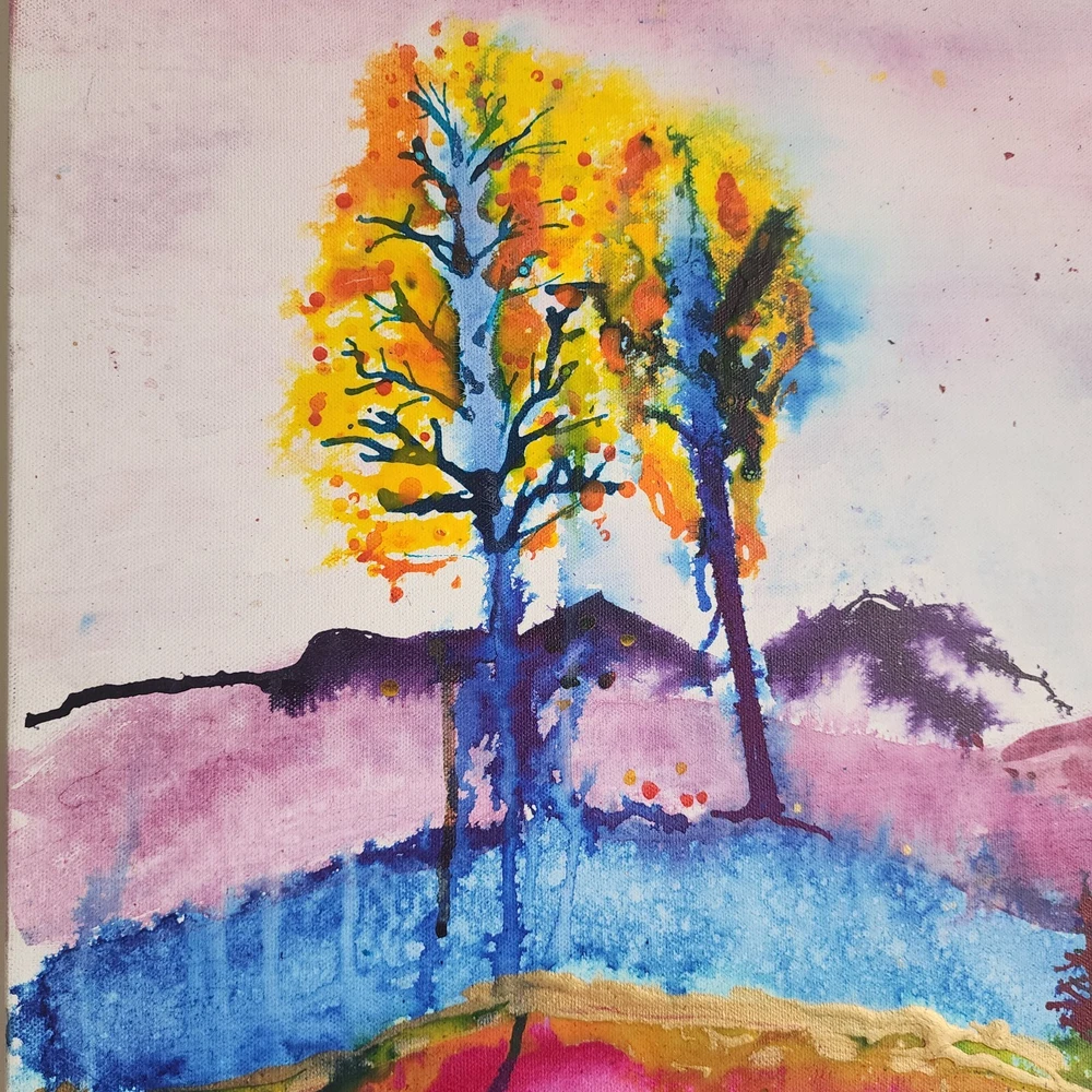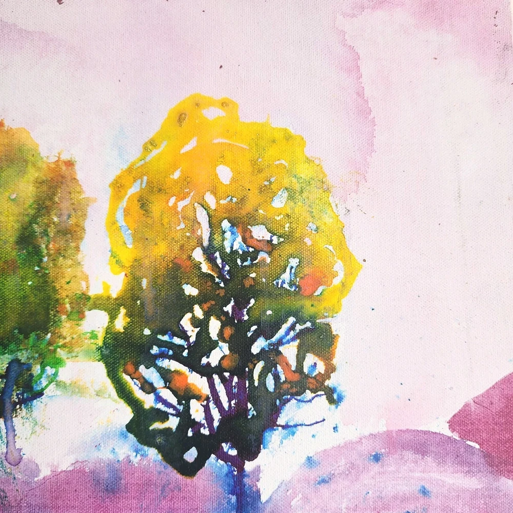This contemporary watercolor painting is quite large, measuring 40"x30"x2." The painting is stretched around the sides and therefore does not need to be framed. This painting is unsigned, and the artist is unknown. The imagery is that of a landscape filled with trees in a rainbow of bright colors. Wavey lines represent changes in elevation both in the foreground and behind the trees. Touches of gold have been strategically placed throughout the picture to add highlights. This modern piece can cover a large wall and offer a burst of color; perfect for breaking up the monotony of an otherwise bare wall.