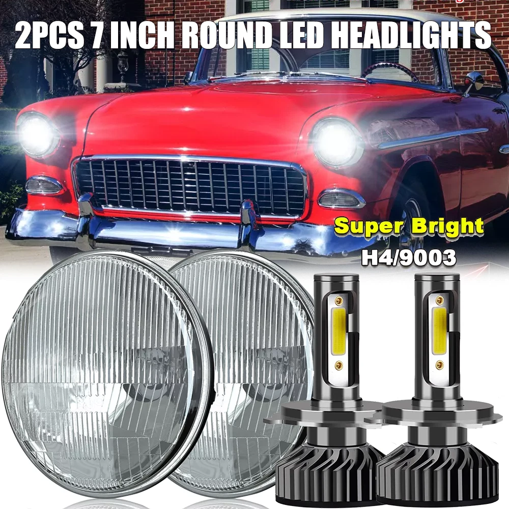 7" Inch Round Diamond Crystal Clear Glass Lens / Headlight Conversion Kit contains everything you need to upgrade your headlights to the newest LED headlight technology while keeping that classic look! -Made with High Quality Glass Lenses - NOT cheap plastic! -Housing has Removable bulb sockets for you to install the new LED bulbs! -Direct Plug & Play design (certain vehicles will require slight modification) -Professional Installation is highly recommended -Warranty 5 years Pair (2 Bulbs Right And Left) 7" Inch Diamond Crystal Clear Semi Sealed Beam Glass Lens Housing Headlights. This Pair Of Headlights Includes 70W Super White LED H4 Light Bulbs. These Headlights Have A Clean Custom Look But Fit Into The Stock Buckets And Plug Into The Stock Wiring Without Modification. These Light Up 500 Percent Brighter And Whiter Than The Standard Stock Sealed Beam Incandescent Headlight Bulbs. These Have The Original 3 Prong Plug Design On The Back So They Will Plug Directly Into The Original Wiring Harness. These Will Fit Any Car Or Truck That Has 2 Round Glass Headlights That Are 7" Inches. H4 LED Bulbs Specifications -Color: 6000K Cool White -Power Consumption: 70 Watt -Luminosity: 6,000 LM -360 Degree / P2 Series CSP Chip Perfect Beam Angle -H4 - Dual Beam Function (You will have HIGH AND LOW!) -500% Brighter than Stock Halogen -Built in IC Circuit (Current Regulator)-Prevents LED Damage From Voltage Variations & Spikes. -Lifespan: 50,000 Hours -Operating Voltage: DC 12V / 24V -Amperage: 1.9A - 2.9A -Maintenance free, Waterproof IP67, Shockproof -Warranty 5 years Contents: - 2x Headlight Housings - 2x H4 LED Bulbs (Hi/Lo Dual Beam)