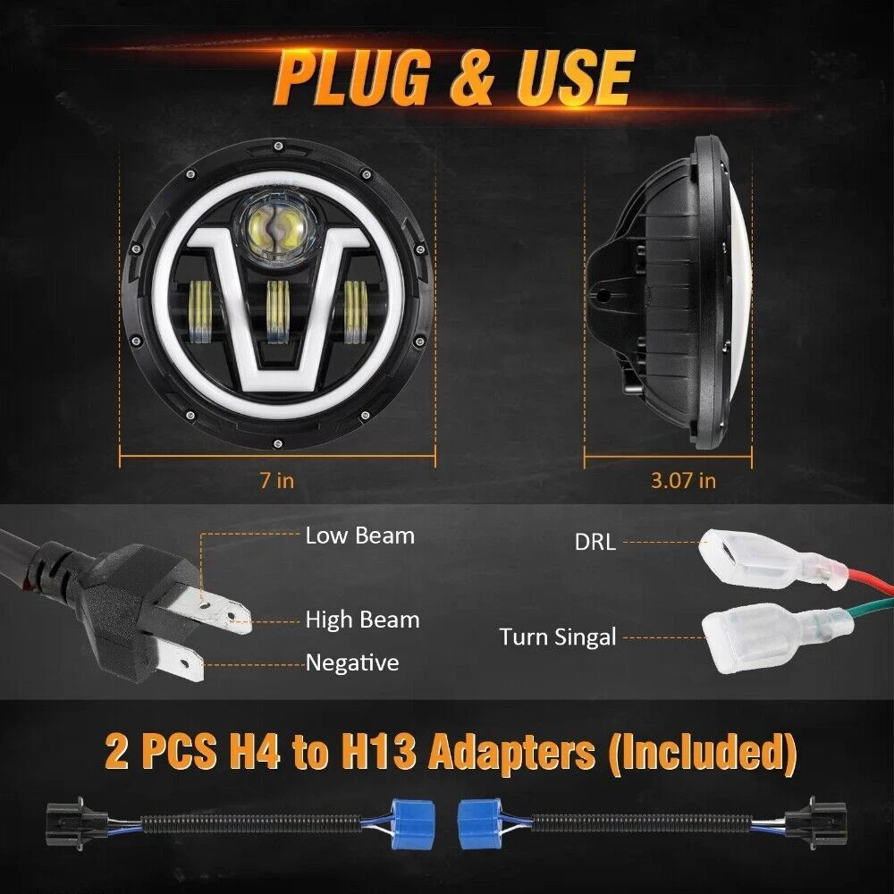 2x 7" round led headlights C10 Package include: 2pc 7" round led headlights 2pc H4-H13 adapter Features: Newest Unique Design- 7 inch led headlight with Exclusive Honeycombed LEDs. Special design provides a more steady and concentrated beam pattern to improve the efficiency of illumination. Durable & High Performance- 7 inch Led Headlights comes with exlusive anti-scratch lens. Built in anti-flicker EMC functions to avoid flickering. Shock-proof and IP 68 waterproof. DOT,SAE,E- Mark approved, work well in all kinds of harsh weather conditions. Plug-N-Play Installation- Super easy to install and very straight forward - Usually in 20 Minutes or Less. LED CANBUS, Included 2pc H4-H13 Adapter. Specification: Voltage: DC 9V~32V Luminous Flux: 8000LM@high beam/PC,4800LM@low beam/PC Color Temperature: 5600-6800K White Wattage: 100W/PC Material: high quality black aluminum housing Lifetime: More than 80000 hours Waterproof Rating: IP 68 Dimensions: 7 Inch Surface Finish: Black Housing Connection: H4/9003 Plug Fitment: For Chevrolet G10/20/30 C10/20/30 Pickup Nova Truck