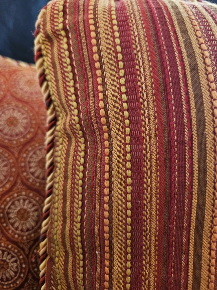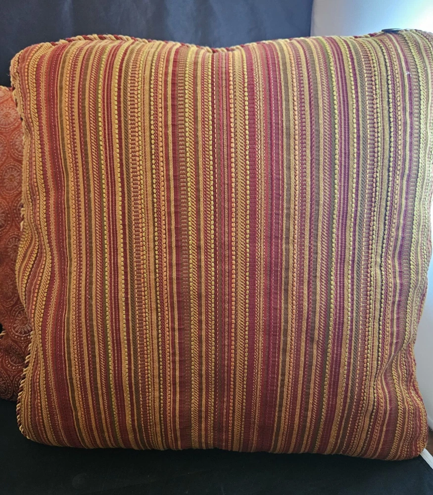 Pair Of Pier 1 Down Throw Pillow Reversible Medallion Striped Brocade 18"x 18" Great holiday colors. The pair is in excellent condition. Please see pictures for details and measurements.