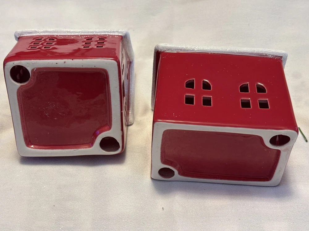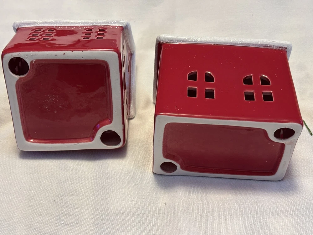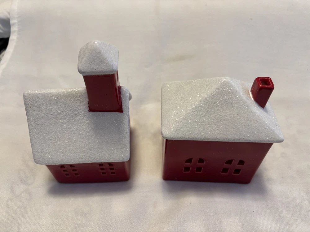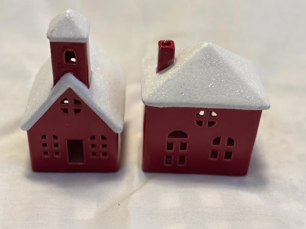 The "Red Houses Ceramic Snow Roofs" is a set of two small ceramic houses ( one house/ one church) figurines featuring red houses with snow-covered roofs. These American-style houses have a 3D effect and a high gloss finish, making them suitable for displaying on windows or furniture in any room. The design features a snowy village theme, perfect for the holiday season, or all winter long. The a glossy red and white color scheme adding a festive touch. Each house measures 4.5 inches in length and 6 inches in height, and they weigh a total of 2 pounds. Sold as set. Made in China in 2020, these houses are part of the Snow Village collection. The houses are for decor and are NOT a toys! Returns accepted within 30 days; buyer pays return shipping