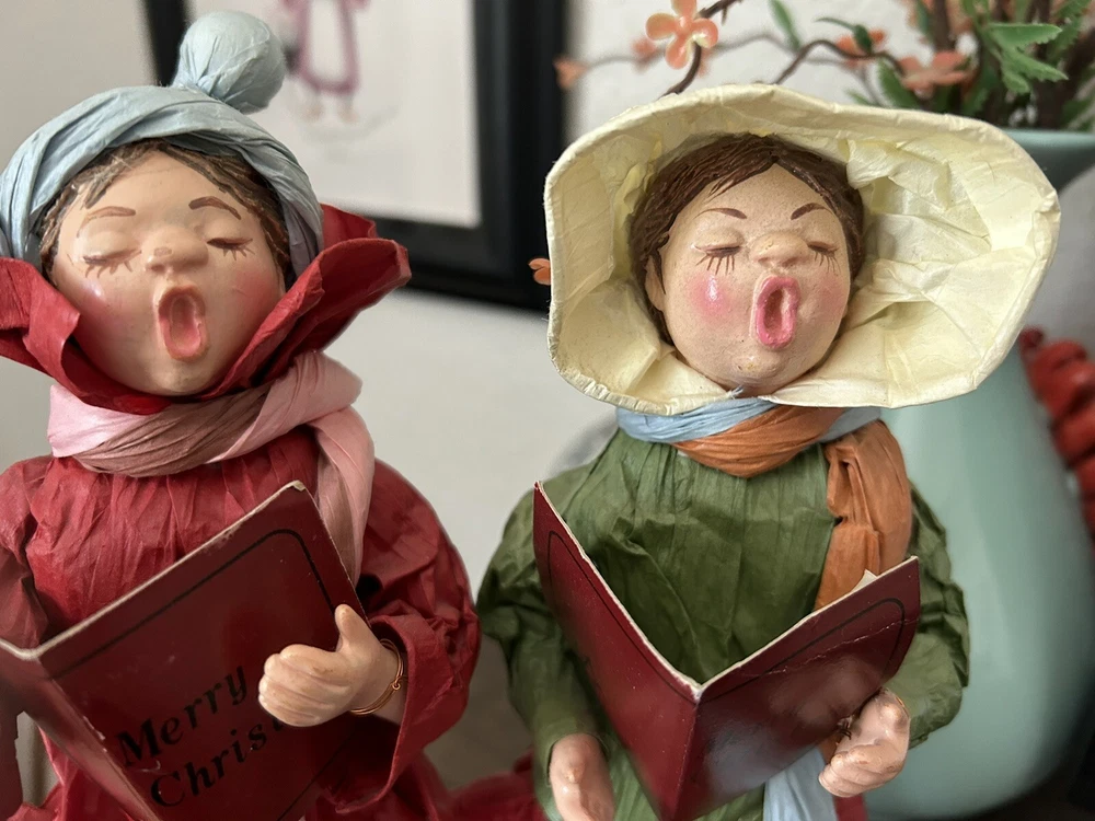 Add some vintage charm to your Christmas decor with this pair of paper mache figurines. These carolers are perfect for the holiday season and will bring a touch of festive cheer to your home. Crafted from high-quality materials, these figurines are sure to last for years to come. Measuring at 9.5 inches, these medium-sized figurines are ideal for display on a shelf or tabletop. The multicolor design and intricate details make them a great addition to any collection. Whether you're a collector or just looking for a unique Christmas decoration, this pair of vintage paper mache figurines is sure to impress.