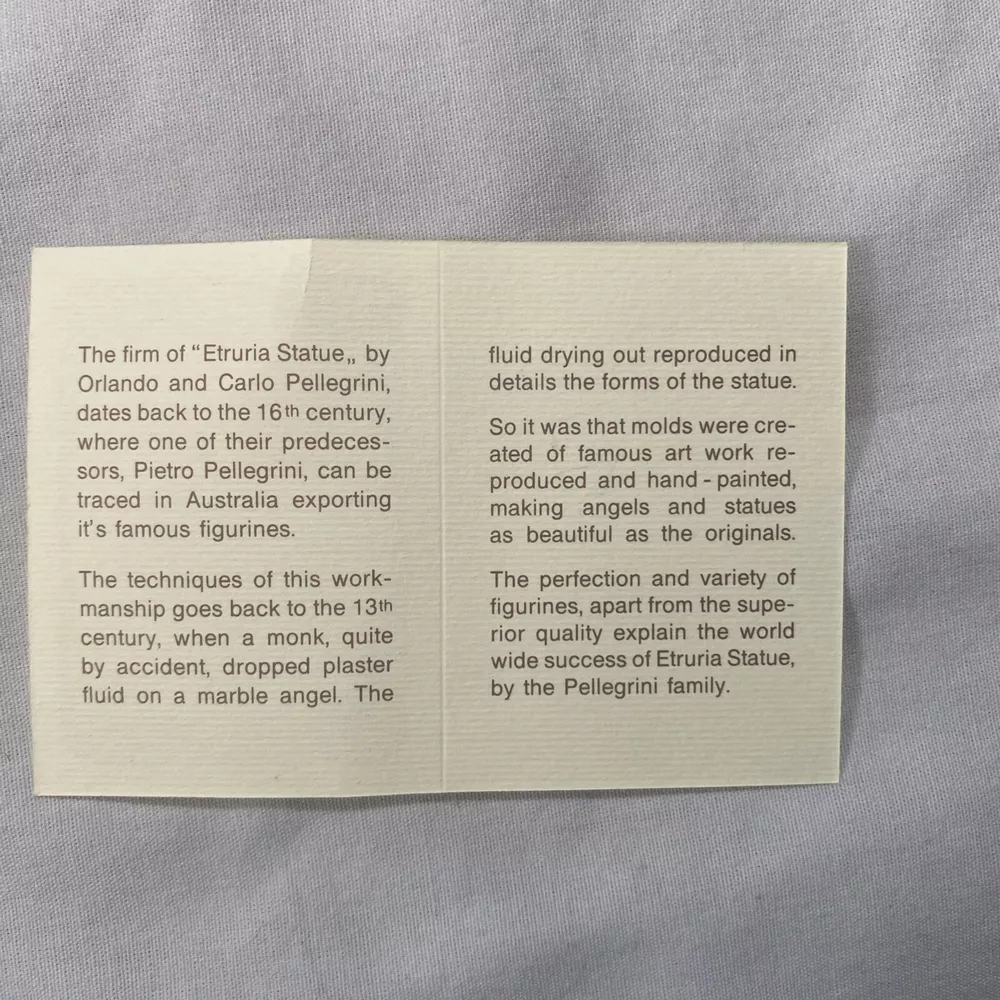 Subject:AngelsType:FigurineFeatures:Hand PaintedDepartment:AdultsCollection:OrnamentsOccasion:All OccasionsRoom:Any RoomPackaging:BoxArtist:PellegriniTheme:ChristmasSeller Notes:“Good condition as seen in photos.”Country/Region of Manufacture:ItalyBrand:Etruria StatuesSize:SmallColor:MulticolorCharacter Family:AngelMaterial:ResinFinish:PaintedNumber in Pack:2Style:ItalianItem Length:5 inOriginal/Reproduction:Original