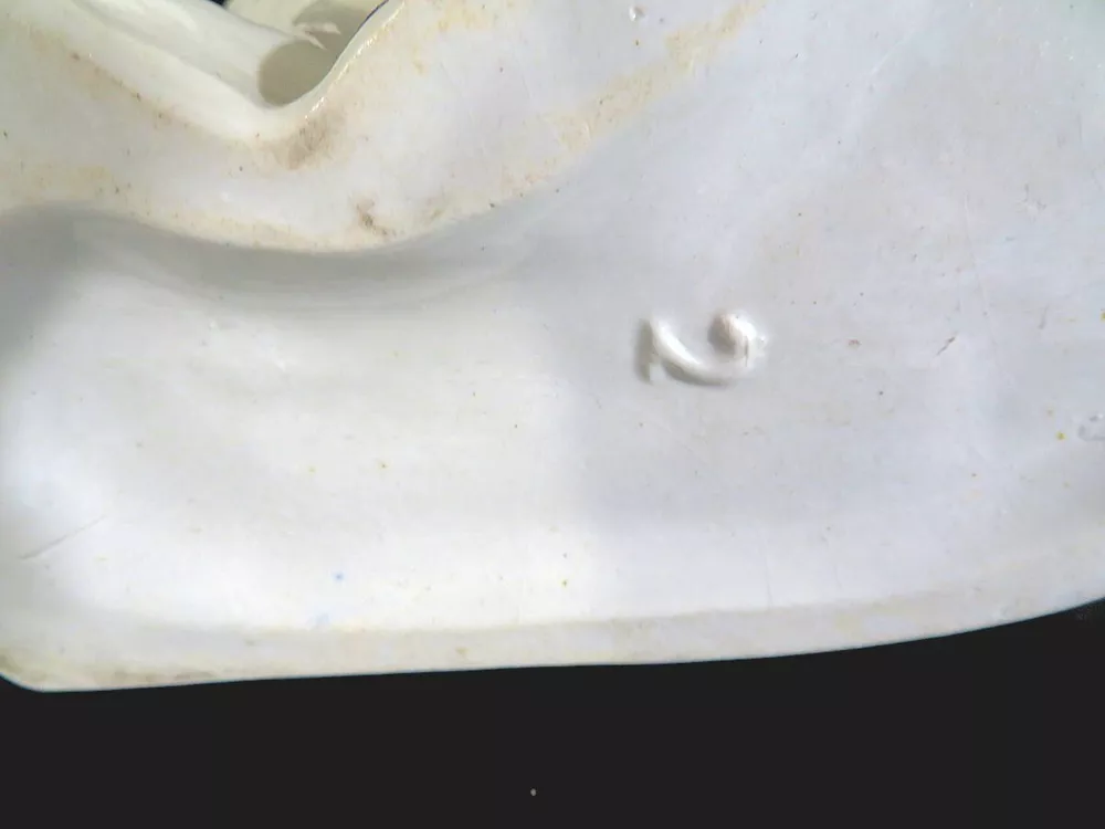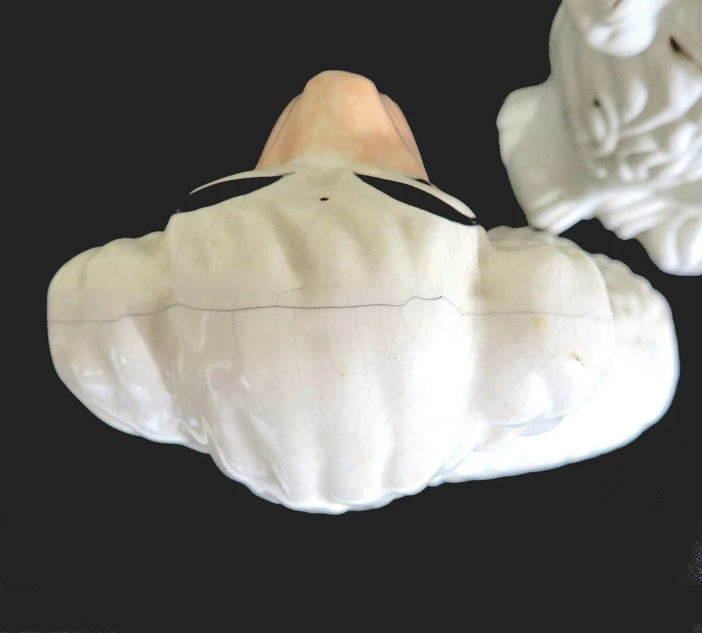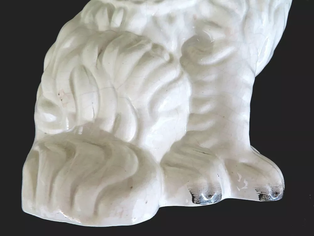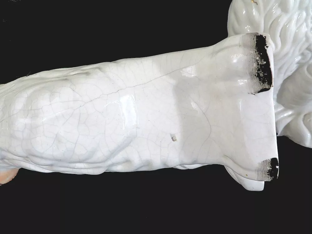 A pair of 19th century white Staffordshire hearth/wally dogs. 10" tall. There is loss of gold paint on both. One is undamaged. The other has crazing and some apparent faint hairlines and a firing crack along the mold line on the head. They still display well. SEE PHOTOS. SOLD AS IS. Priced accordingly.