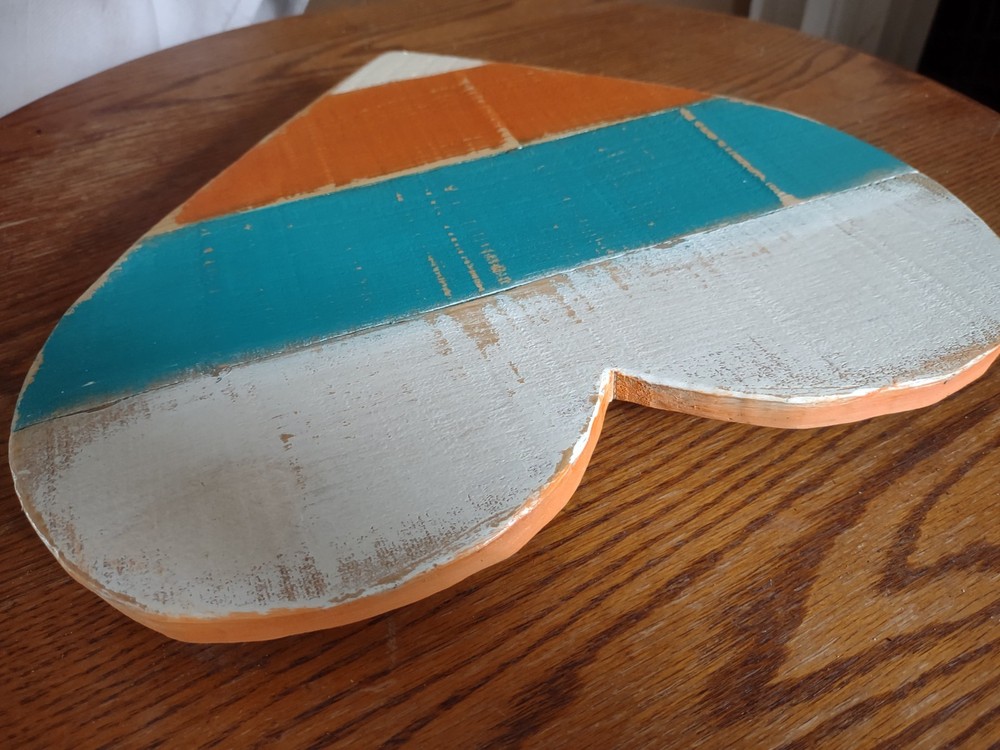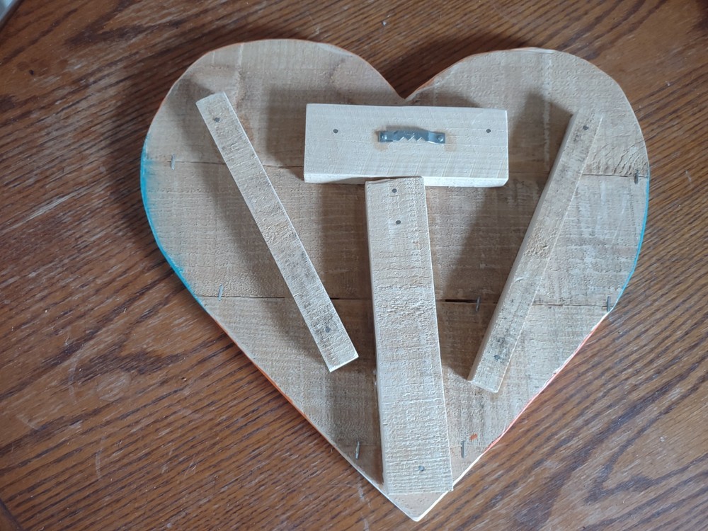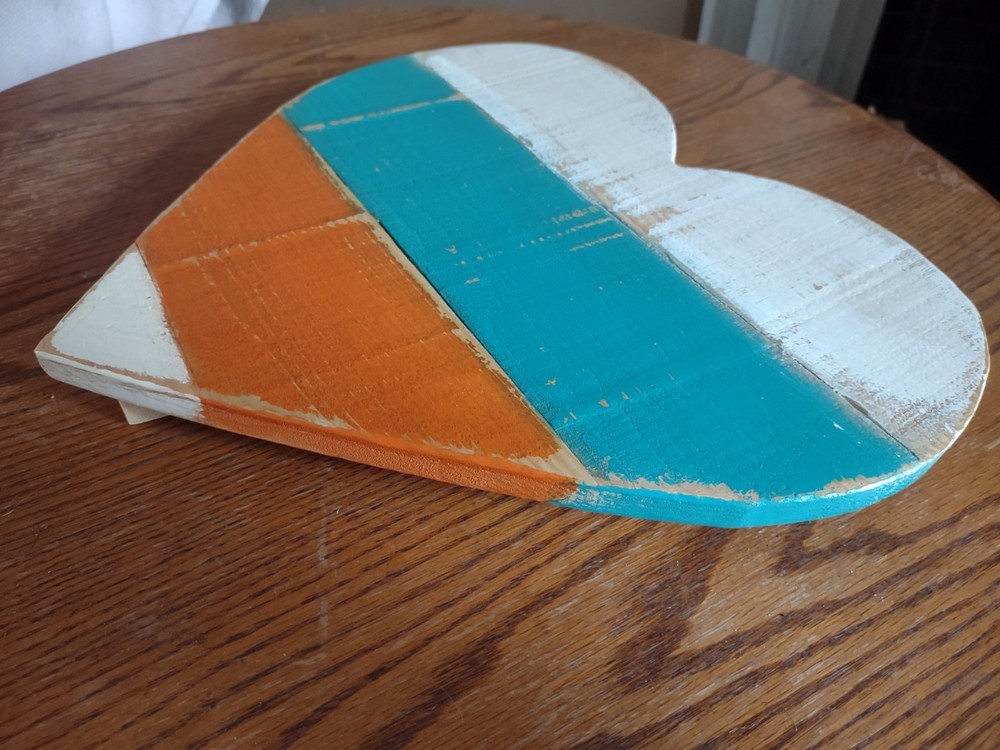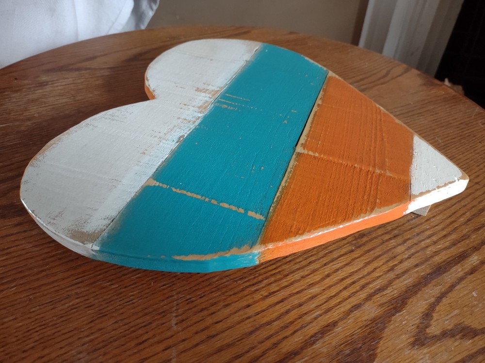 The product is a rustic wooden door decor in the shape of a heart, featuring a primitive style design. Made of wood, this door sign is perfect for adding a touch of natural charm to your home décor, with a theme that conveys love and hearts. Ideal for those who appreciate unique and handmade pieces that bring a romantic touch to their living space. Made from reclaimed pallet wood and hand painted.