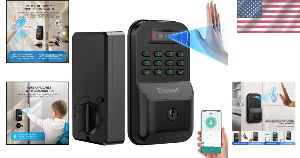 Palm Recognition Keyless-Entry Smart Lock: Advanced Biometric Security Solution < class="slides"> ‹ › ‹ › ‹ › ‹ › ‹ › ‹ › ‹ › ‹ › Palm Recognition Keyless-Entry Smart Lock Advanced Biometric Security Solution Innovative Technology: <> Advanced palm recognition technology transforms your unique palm vein patterns into your key. Faster, more accurate, and secure unlocking experience compared to traditional methods. Infrared sensing up to 30 centimeters detects your presence for seamless access. Benefits: <> Contactless Unlocking: 99.99% accuracy ensures reliable recognition. No Age Restrictions: Ideal for all ages—children and elderly can use it comfortably. Security Upgrade: Unique palm vein characteristics make forgery nearly impossible. Privacy Protected: Your palm ID information is securely stored on your device, ensuring privacy at all times. Why Choose Our Palm Recognition Smart Lock? This innovative palm recognition smart deadbolt not only enhances your home's security but also streamlines access with unparalleled convenience. Unlike traditional keypads or fingerprint systems that may fail with sweaty or dirty hands, this advanced lock harnesses distinctive vein patterns for consistent and reliable recognition. Experience worry-free access for your entire family, with no need for keys or codes. Enjoy peace of mind knowing your home is protected by cutting-edge technology that keeps your privacy intact and your security uncompromised. Upgrade your home with this advanced biometric smart lock today—your ultimate guardian for modern living! Shipping <> <> Free & Fast Shipping - We offer free shipping to most of the USA with a normal delivery time of 3-7 days. However, due to the current situation, additional delivery time (up to 3 weeks) may be required for some items. Alternative Carriers - We may use alternative carriers (e.g. USPS, FedEx, UPS, etc.) to ensure your package arrives safely and on time. Due to the use of multiple carriers, we are unable to provide a tracking number automatically. Handling Time - Orders are processed and shipped within 1-2 business days of receiving cleared payment. Shipping Restrictions - Shipping to Alaska, Hawaii, Puerto Rico, Guam, and other US territories may incur shipping charges or delivery restrictions. Please contact us before ordering, or your order can be refunded/cancelled. State Restrictions - There may be restrictions based on your state of purchase. For example, certain items may not be shipped to California due to state regulations. Contact for Tracking Updates - If you require tracking updates or have any concerns about the delivery of your order, please feel free to contact us, and we will be happy to assist you. Return <> <> 30-Day Hassle-Free Returns - We want you to be completely satisfied with your purchase. If you are not, you can return the item within 30 days of receiving it for a full refund or exchange. Easy Return Process - To start a return, simply contact us and we will provide you with a prepaid return shipping label and detailed instructions. Restocking Fee - There are no restocking fees for returns. However, the buyer is responsible for return shipping costs if the return is not due to a seller's error. Refund Processing Time - Refunds will be processed within 5 business days of receiving the returned item in its condition. Payment We accept all major credit cards, PayPal, and Apple Pay for your convenience. Your payment information is secure and encrypted to ensure a safe and seamless transaction. Please complete your payment within 3 days of purchase to avoid any delays in shipping. Feedback Your feedback is extremely important to us. We strive to provide the best products and customer service possible. If you are satisfied with your purchase, please take a moment to leave us a positive review. If you have any concerns or issues with your order, please contact us before leaving negative feedback. We are committed to resolving any problems and ensuring your satisfaction. Contact Us If you have any questions or concerns, please feel free to out to our customer support team. You can contact us through the eBay messaging system. We are available Monday to Friday, 9:00 am to 5:00 pm EST, and we will do our best to respond to your inquiry within 24 hours. Buy it now and enjoy a pleasant shopping experience! Unit Quantity: 2.38 pounds Material: Alloy Suitable For: Residential,Residential security,Keyless convenience Mounting: Universal Features: Easy to Install,Electronic,Keyless,Auto Lock,Fingerprint Items Included: K9001 deadbolt door lock,2 standard key,latch,strike plate,installation instructions,programming instructions Type: Smart Lock Color: Black Finish: Painted Number in Pack: 1 Style: Palmar vein recognition Item Depth: 1.18 inches Door Handing: Universal/Reversible Item Weight: 2.38 pounds Unit Type: lb
