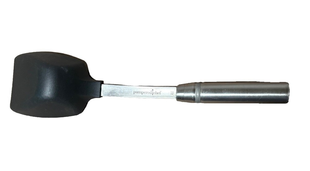 Elevate your kitchen arsenal with the Pampered Chef Scoop & Serve Spatula, a versatile tool designed for effortless scooping and serving. Crafted from durable nylon with a no-roll stainless steel handle, this 14-inch spatula is a perfect addition to your cookware collection. Its heat-resistant feature ensures longevity and ease of use, making it a reliable companion for all your culinary adventures. The spatula's solid black color and sleek design provide a touch of elegance to your kitchen. It's a single-piece set, which means you'll have a complete tool without the hassle of juggling multiple pieces. Ideal for everyday use or special occasions, this spatula is a must-have for anyone who loves to cook and wants the job done with style and efficiency. R10431-12-18.13.3-19