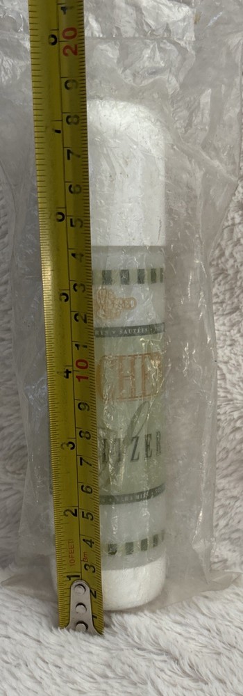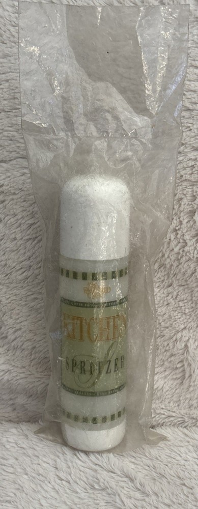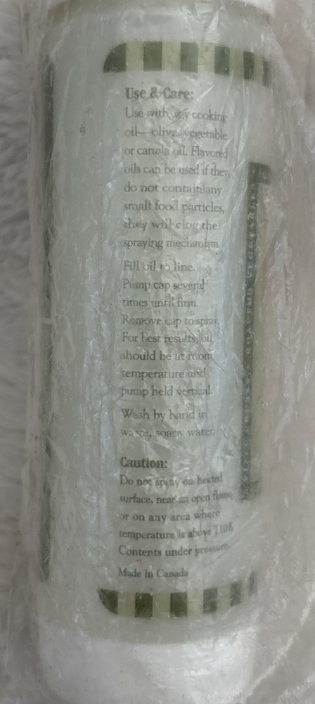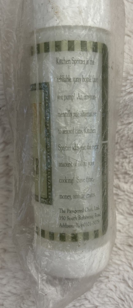 The Pampered Chef Kitchen Spritzer is an oil bottle made of plastic, featuring a white and green color scheme. Standing at 7 inches tall with a diameter of 1 3/4 inches, this item is perfect for dispensing oil in the kitchen. Easy to clean and manufactured in Canada, this spritzer is a convenient and stylish addition to any kitchen tools and gadgets collection. Still in plastic unused