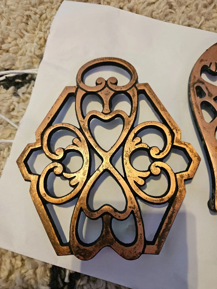 This is a set of two Pampered Chef Round-Up from the Heart 2006 and 2011 trivets. They are medium-sized trivets made of copper-colored cast iron. The trivets have a decorative design and a copper finish, perfect for protecting surfaces from hot dishes in the kitchen or dining room. Made in China, these trivets are both functional and stylish additions to your home decor. Cute and functional. See pictures for condition While I'm just getting started listing on Ebay and learning how things work now, I am not completely new to the Ebay. 18 years ago I was a single Mom of 2 that made our living selling on Ebay. Fast forward and a few more kids and wonderful husband I have decided to try to earn a few extra bucks and give it a whirl. I'm anxious to build a positive feedback score with lots of happy customers. I do my very very best to research and list my items accordingly. I am not a professional antiquer or even close to it. Please take the time to ask questions about an item or let me know if you feel I have not represnted something accuratley. You may also notice that some of my pictures and listings appear to be in hospitals. I spend 6 hours a week getting infusions and have learned it is a great time to stick some listings up