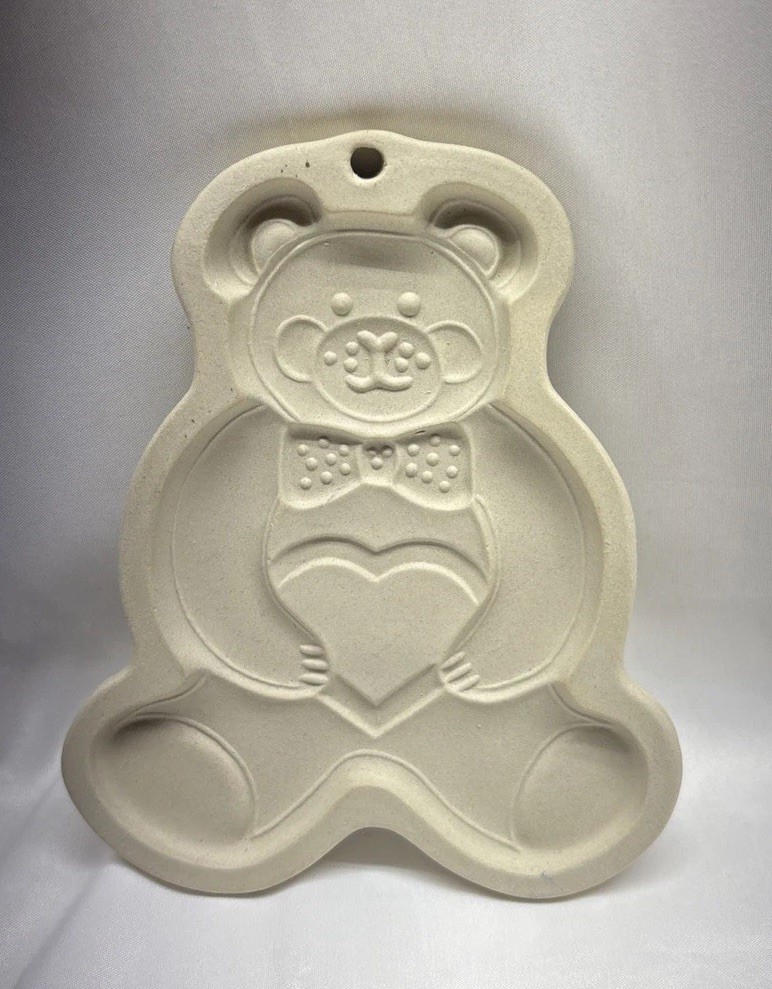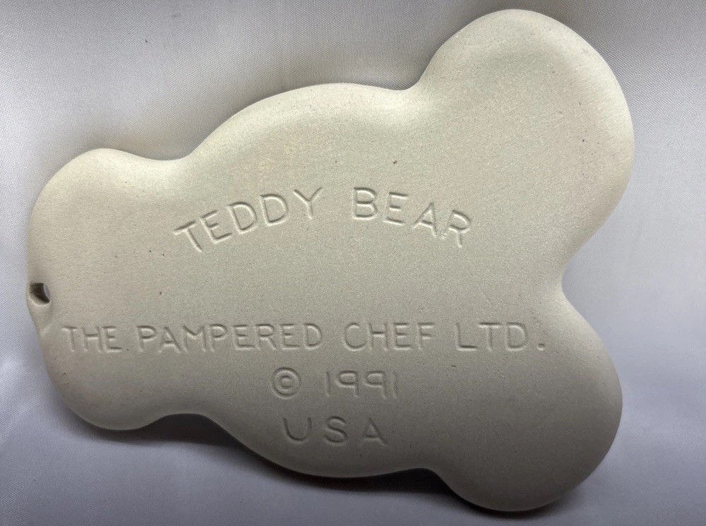 The Pampered Chef Teddy Bear Heart Stoneware Cookie Mold Press is a vintage baking tool from 1991 that allows you to easily make heart-shaped bear cookies. Made of durable stoneware in a beige color, this cookie mold press is a charming addition to any kitchen. With its small size and adorable bear design, it is perfect for crafting cookies for all occasions, especially those with a bear theme. Made in the United States by the trusted brand Pampered Chef, this cookie mold is sure to bring joy to your baking experience. Looks to not be used open box