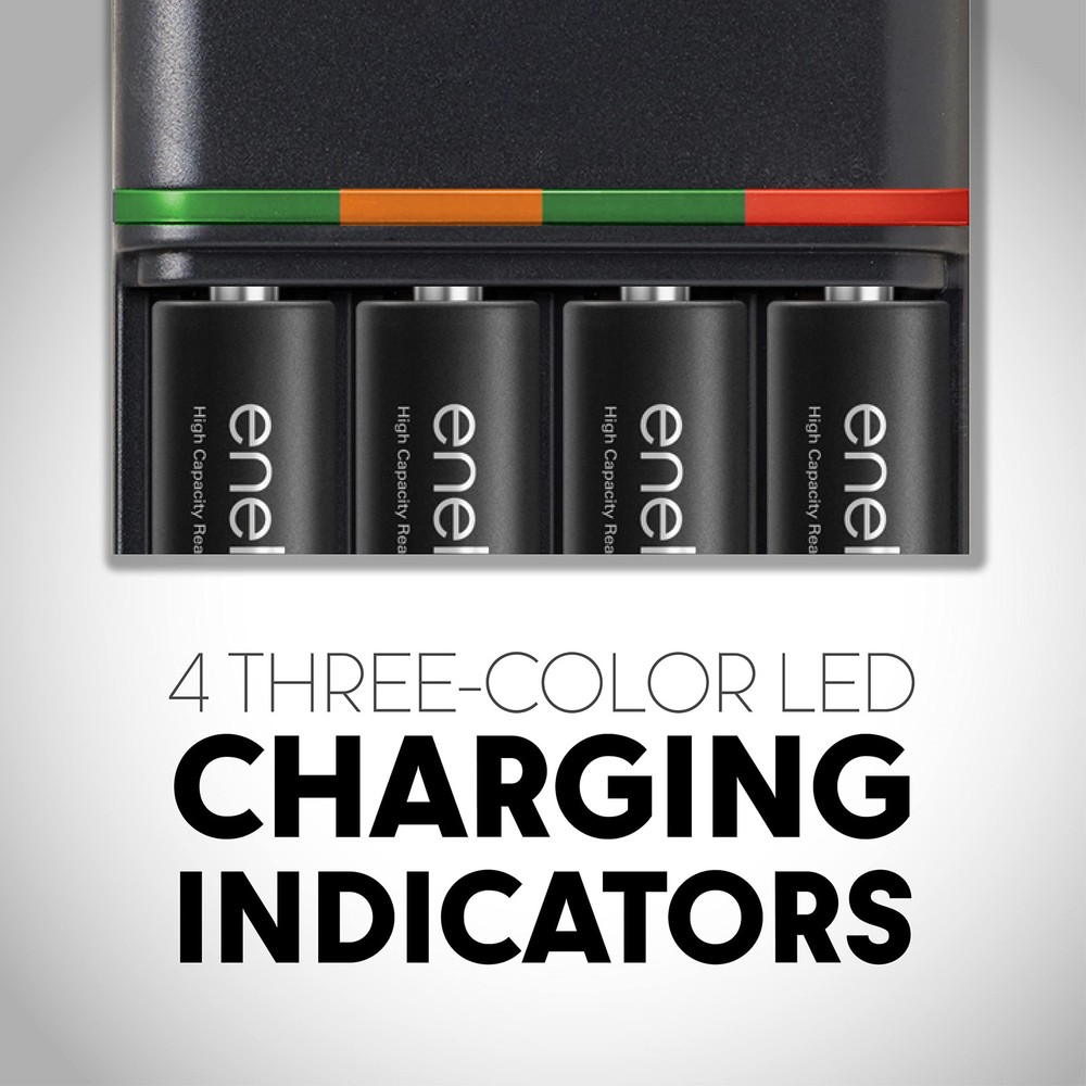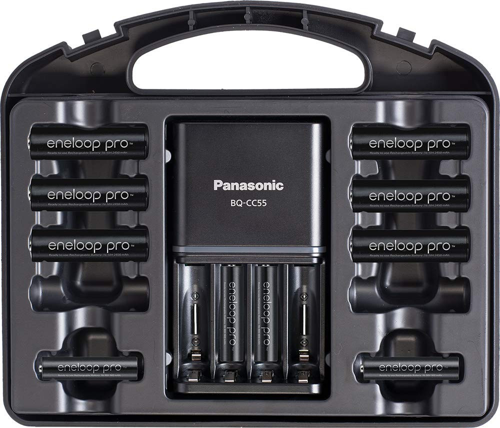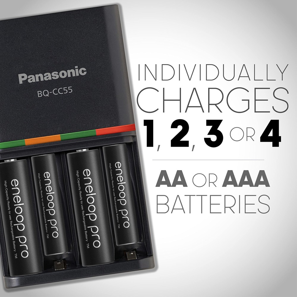 pro AA and AAA NiMH ready to use rechargeable batteries utilize Panasonic advanced rechargeable battery technology, allowing them to be recharged up to 500 times. pro AA and AAA rechargeable batteries deliver consistent power performance, maintain 85% of their charge for up to 1 year (when not in use and stored properly), come pre-charged by solar power (at the factory) and are ready to use out of the package. These pro batteries also feature extreme temperature performance down to -4 deg F. Pair pro and AA and AAA batteries with Panasonic advanced, quick advanced, or super quick advance pro chargers to maximize your rechargeable battery experience. The Panasonic pro BQ-CC55, 4-position Ni-MH battery charger can quickly, and individually charge any combination of up to four AA or AAA pro batteries in just 4 hours (one to two AA or AAA batteries can be fully charged in up to just 2 hours). Individual charging means you can easily and efficiently charge from 1 to 4 batteries with differing levels of remaining charge. A huge time saver! The CC55 charger also features 4 individual LED charge indicator lights. Once batteries are installed, the charger measures each cell and the corresponding light indicates the remaining charge; Green 80 to 100%, Orange 20% to 80%, and Red 0% to 20%. After each battery reaches the next level of charging the LED light changes to indicate the cells charge level. Once the battery is completely charged, the LED light turns off for that cell. Ideal for use at home, in the office, or on the road, this Panasonic CC55 charger is a quick and convenient way to recharge any combination of up to four AA or AAA Ni-MH pro, , or conventional Panasonic Ni-MH rechargeable batteries.. EXTREMELY POWERFUL NiMH RECHARGEABLE BATTERIES: pro AA high capacity Ni-MH pre-charged rechargeable battery deliver up to 2550mAh typical, 2450mAh minimum; pro AAA high capacity Ni-MH pre-charged rechargeable battery deliver up to 950mAh typical, 900mAh minimum LONG LASTING PERFORMANCE: Recharge pro AA and AAA rechargeable batteries up to 500 times PRE-CHARGED AND READY TO USE: pro AA and AAA rechargeable batteries are pre-charged at the factory using solar power and maintain up to 85% of their charge after 1 year (when unused and properly stored) ADVANCED CHARGING CAPABILITES: The Panasonic CC55 battery charger individually charges each pro AA and AAA rechargeable battery, resulting in a perfect charge every time 4 INDIVIDUAL LED COLOR INDICATORS: The CC55 battery charger features 4 separate LED charging lights, one for each unique charging station. Remaining battery charge is checked individually; green LED light (80+% charged); orange LED light (20% - 80% charged); red LED light (20% or less charged) QUICK CHARGING TIMES: The CC55 battery charger will charge a fully discharged pro 4AA batteries in approximately 4 hours; pro 2AA or 2AAA in up to 2 hours. SECURE, PROTECTIVE PACKAGING: This product contains 6 pro AA rechargeable batteries, 6 AAA pro rechargeable batteries, a CC55 advanced quick rechargeable battery charger, and a convenient plastic battery storage case, packaged together in the U.S.A.