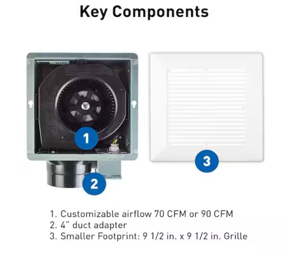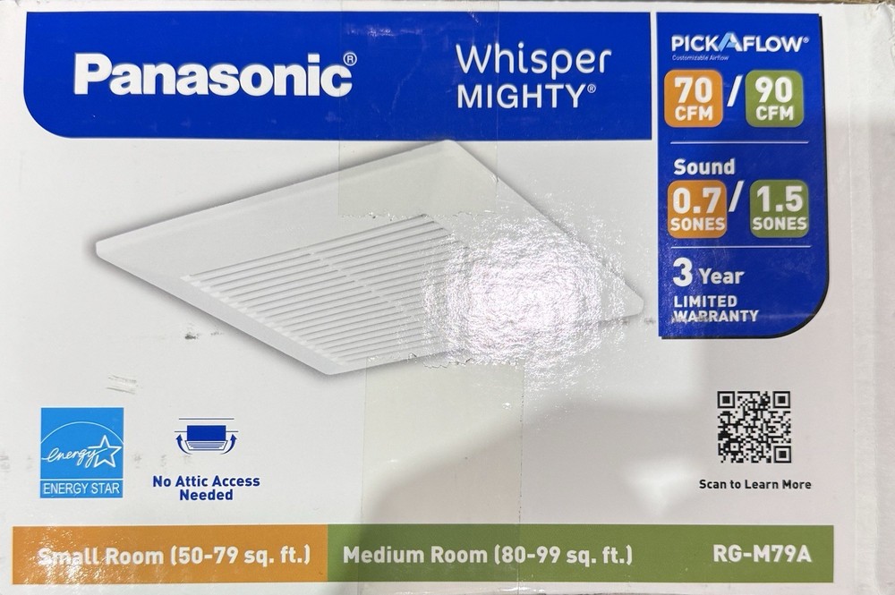 LIKE NEW About This Product This Energy Star-Certified exhaust fan is ideal for bathroom ventilation. The Pick-A-Flow Speed Selector offers flexibility with a choice of airflow, 70 or 90 CFM, to ensure optimum performance. It's powerful, extremely quiet, energy-efficient, long-lasting, and easy to install in the ceiling or wall. In addition to the bathroom, this fan is perfect for the laundry room, sunroom, basement, or garage. It will increase your air quality, eliminating humidity, mold, mildew, and other air pollutants from any room. Highlights Bathroom vent fan: equipped with a revolutionary DC/ECM motor, this whisper quiet, energy star-certified exhaust fan offers efficient ventilation for small to medium sized rooms Customizable Airflow: Features Pick-A-Flow technology that allows you to select your desired airflow from 70 or 90 CFM at the flip of a switch for your room size and usage needs Versatile Installation: Can be mounted to ceiling or wall; Includes pre-attached junction box, 4" duct adapter and all mounting hardware; UL listed for tub/shower enclosure when used with a GFCI protected circuit Explore Our Selection: We offer a wide range of vent fans including fans with LED lights, timers, heaters, and condensation sensors for humidity control, plus installation kits, soffit vents, replacement motors and fan cover grilles Healthy Living Begins with Clean Indoor Air: Ensure a healthy home for your family with our high-performance Panasonic ventilation systems, air purification devices and HVAC solutions Click here for more information on Electronic Recycling Programs Return Policy Product Information Internet # 320467425 Model # RG-M79A Store SKU # 1007773033