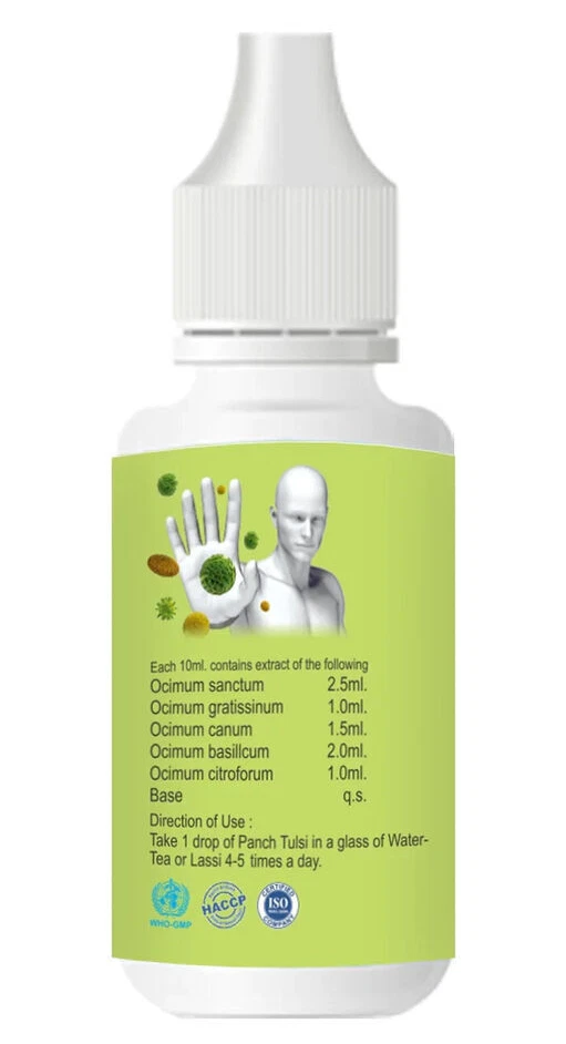 Bhumija Tulsi Drops Bhumija Lifesciences Panch Tulsi 25ml, The Unique Composition, Preparation of 5 types of Tulsi Ark- Nimbu Tulsi, Shyama Tulsi, Van Tulsi, Shwet Tulsi & Rama Tulsi. It is a Natural Imuniuty Booster. Panch Tulsi Ark has all the anti-inflammatory properties which may help lower inflammation, lowers the risk of heart disease, rheumatoid arthritis and inflammatory bowel conditions. Panch Tulsi Ark has super natural health benefit qualities and may helpful in all types of Allergies. According to Ayurveda, Tulsi can be useful in cough, cold, dyspnoea and hiccups. May also be helpful in sore throat, bronchitis, bronchial asthma and malaria. In Panch Tulsi Ark, Rama Tulsi helps to get rid of cold, fever, cough, etc where Shyama Tulsi helpful in immunity booster. So, a combination is perfect for an overall healthy life. FSSAI, GMP AND ISO APPROVED: Manufacturing of Our Bhumija Lifesciences Tulsi Ark, followed all the guideline created by government such as GMP (Good Manufacturing Practice) Under food and safety standards authority of India (FSSAI) License and ISO 9001-2015 certification. Dosages: 1-2 drops 3-4 times a day with Water, Tea or any Liquid or as directed by healthcare professional. Naturally derived ingredients with no side effects. Panch Tulsi Benefits: Tulsi has a lot of benefits. It has super natural health benefit qualities and helpful in all types of Allergies. It has beneficial effect on mind and body. It supports relaxation to mind and body. Scientists have also acknowledged the medicinal properties of tulsi. Tulsi keep away the deadly fevers like Dengue, Malaria, Swine Flu etc. The intake of tulsi is the best way of intestine cleaning. It is may very effective in any kind of gynaecological problem. So, our Bhumija Lifesciences Panch Tulsi Drops is may very effective in cough, cold, acidity, constipation, stomach pain, abdominal pain, and Viral or Seasonal fever, swelling in Lungs, hypertension, chest congestion, fatigue, vomiting, obesity, arthritis, asthma, anaemia and ulcers. It promotes the purifying the blood and increases the immunity of human body. It may also work in controlling diabetes. It supports Anti- Bacterial and Anti- Viral Action. Panch Tulsi is disease resistant. It is said that it has world's best anti-oxidant, anti-aging, anti-bacterial, anti – septic, anti-viral, anti-flu, anti-biotic, anti – inflammatory, and anti-disease properties. Panch Tulsi Drop is made by using extract of 5 types of Tulsi like Shyam Tulsi, Rama Tulsi, Shwet Sursa, Van Tulsi and Nimbu Tulsi. Tulsi is useful in more than 200 diseases like flu, swine flu, dengue, joint pain, stone, blood pressure excess weight, sugar, allergy, hepatitis, burning, urine related problem, gout, piles, pariah, haemorrhage, swollen lungs, ulcer, stress, lack of semen, tiredness, loss of appetite, vomiting, hiccups, stomach ache, stomach bug etc. Mix 2 drops of T5 Tulsi Drop with honey to get relief from cold, cough, sneezes and headache. It's may very effective in winters in unconscious condition put drops of Panch Tulsi Drop with salt in nose. It’s very effective. May beneficial for cancer patients. Mix 2-3 drops of Panch Tulsi Drop with curd take it. Take maximum curd & milk as food. May beneficial for a child suffering from cold, cough or loose motions, mix one or two drops of Panch Tulsi Drop with honey & give to the child. After lunch have one drop of Panch Tulsi Drop, it may help to cure stomach related diseases. Panch Tulsi Drop support relieves in itching, eczema etc and all other skin related diseases & wounds. Panch Tulsi Drop support purifies blood, and may helpful to increase haemoglobin. Daily intake of 4-5 drops of Panch Tulsi Drop may controls nausea & vomiting in pregnancy. A friend of women in all problems. Especially support in fire burns or any poisonous insect attack. To control hair fall & premature greying of hair & dandruff, you may use 8 -10 drops of Panch Tulsi Drop with aloe herbal hair oil and apply on the head & forehead. For best results apply this at night & wash it in the morning. In ear pain and ear flow, pour one drop of Panch Tulsi Drop in each ear may helpful. In Tooth pain, cavity, bleeding gums, have gargles with warm water mixed with 4-5 drops of Panch Tulsi Drop may helpful. To get rid of bad breath have 1-2 drops of Panch Tulsi Drop daily after meals may helpful. Throat pain, ulcers may be relieved by Panch Tulsi Drop. In asthma and cough have Panch Tulsi Drop with ginger ras and honey in the morning and evening, may be effective. At night mix 8-10 drops of Panch Tulsi Drop in body oil, it may relieve you from mosquito bite and you will have a sound sleep. Mix 8-10 drops of Panch Tulsi Drop in water cooler. It may help to keep your house free from mosquitoes and makes the environment bacteria free, clean and pure. Lice: Equal quantity of Panch Tulsi Drop & lime juice to be applied to the hair & kept for three hours. Wash hair, the lice may be dead. Panch Tulsi Drop may very useful for heart. It supports in cholesterol level, decreases and reduces blood clots, heart attack and stroke. At the time of bath, mix 8-10 drops of Panch Tulsi Drop in water and have bath. It may help you to keep disease free skin. It is very supportive in skin problems & eliminates stress. Use 1 drop Panch Tulsi Drop in one glass of water or tea or 2 drops in 1 litre water. It may provide you a bacteria-free, healthy and hygienic water. IMPORTANT: As with any supplement, if you are pregnant, nursing or taking medication, consult your Healthcare Professional before use, Discontinue use two weeks prior to surgery. All product statements on this website provides general information. Directions For Use: 1. Mix 2-3 drops in glass of water, tea, juice and more. 2. Mix well 3. Consume daily twice a day after a meal Note: It is recommended to suggest it to a healthcare professional before starting to use the Bhumija Shilajit Resin. Remember, shilajit can lower blood pressure, so