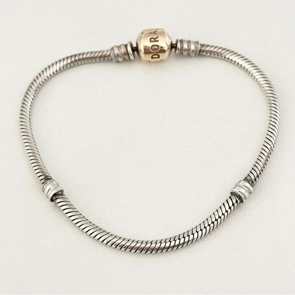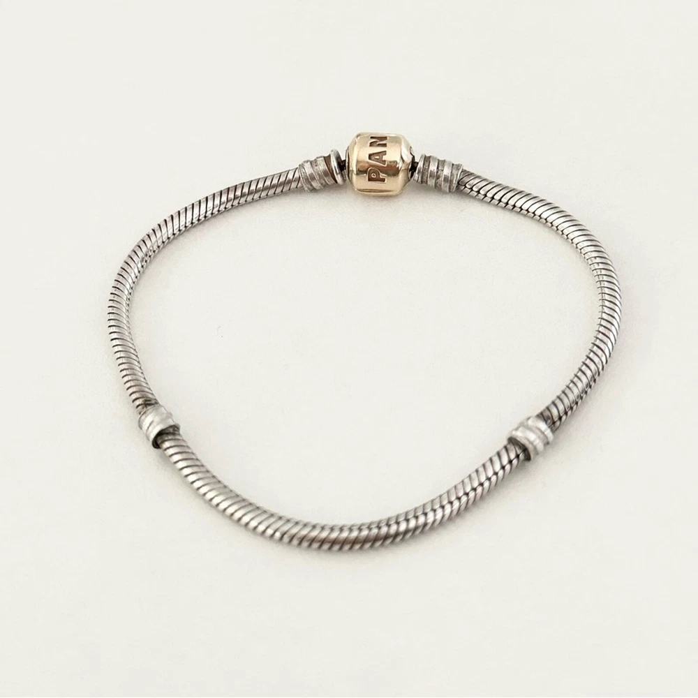 Authentic Genuine Pandora Two Tone Moments Snake Chain Bracelet •Set in sterling silver with a solid 14k yellow gold clasp •Size: 7.5" •Stamped 585 ALE •Excellent condition •Perfect to add to your Pandora bracelet collection or to gift to a friend, mom, girlfriend, daughter, wife, etc. •Please check out my other Pandora charms for sale, bundle and save on shipping! •Fast shipping! I ship same or next business day!