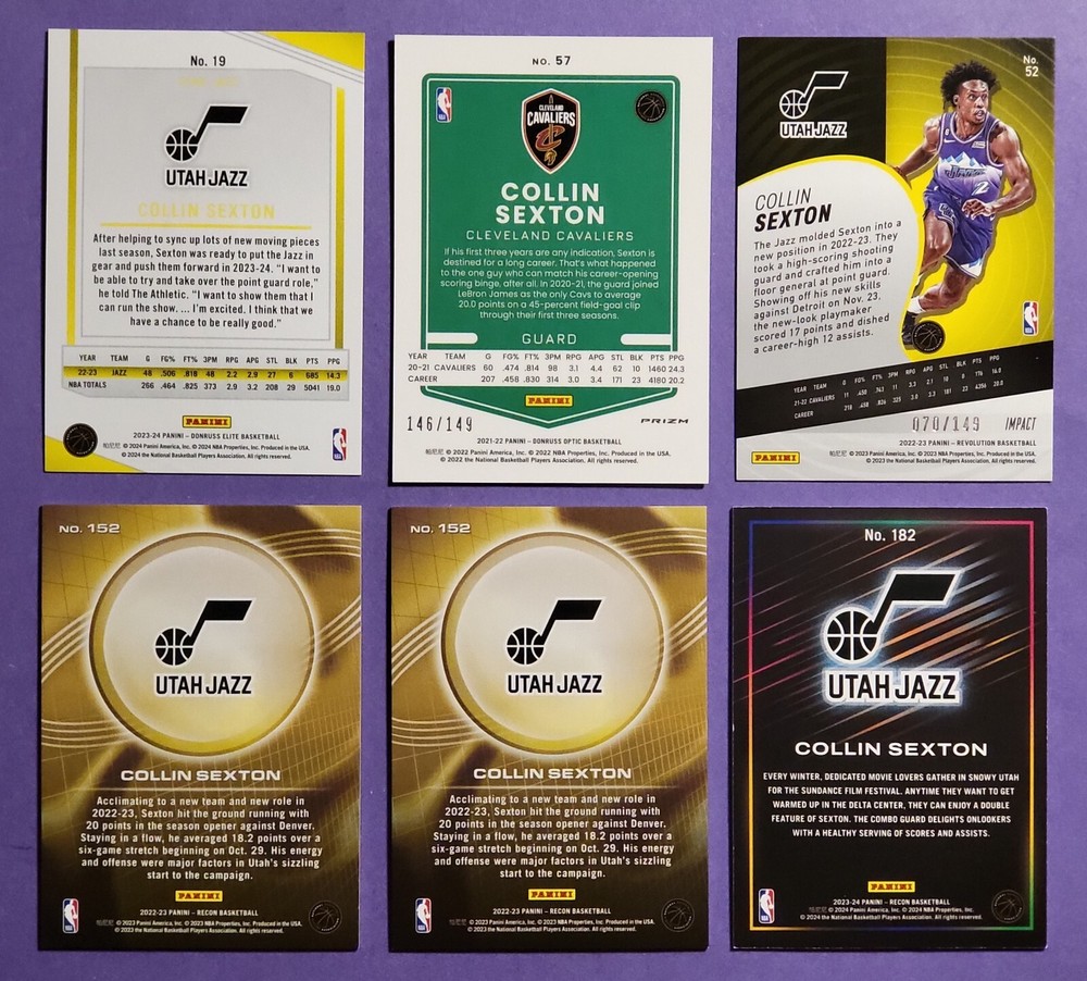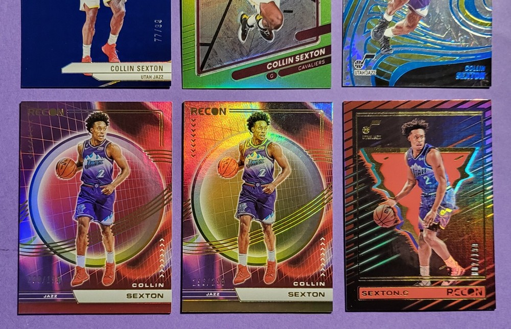 Numbered LOT x 6 *Collin Sexton* Numbered 6-Card LOT 2021-22 Donruss LIME GREEN Parallel (Numbered #146/149) 2022-23 Revolution IMPACT Parallel (Numbered #070/149) 2022-23 Recon RED HOLO Parallel (Numbered #088/199) 2022-23 Recon BRONZE HOLO Parallel (Numbered #293/299) 2023-24 Recon RED HOLO Parallel (Numbered #002/199) 2023-24 Donruss Elite BLUE Parallel (Numbered #77/99) Condition: Our items are fresh out of packs with the least amount of handling possible and treated with the utmost care. However, this item is not professionally graded. I encourage you to review the pictures posted to make a final determination. We only sell high grade cards fresh from packs. If we were to sell a card with significant flaws, they would be noted boldly. Feel free to ask questions, we want you to be comfortable and confident in your purchase! Shipping: Packaged very carefully and professionally within 1-2 days of payment...care goes into this step. Combined shipping always available for multiple purchases! Contact: Please contact us with questions or concerns. We want make sure you're happy with your purchase! Thank you! Card Sick
