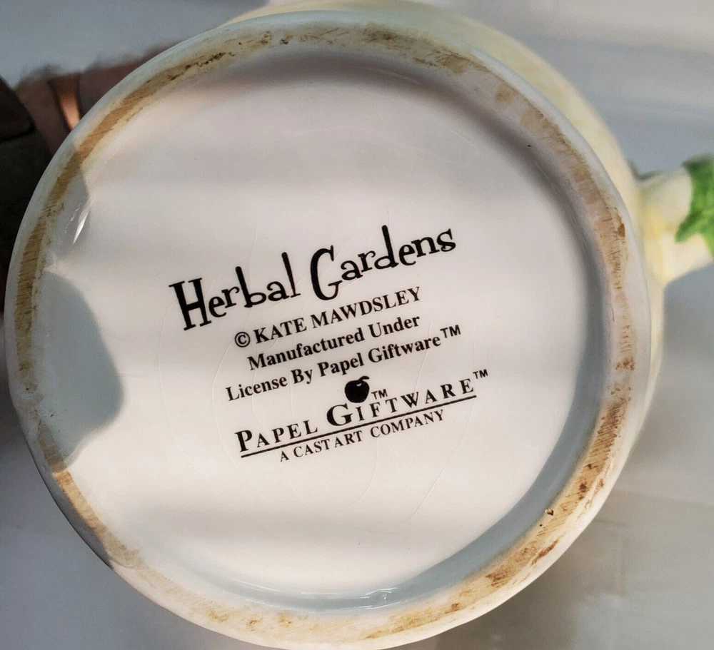 Set Includes:Teapot And LidType:Tea PotOccasion:All OccasionsOriginal/Licensed Reproduction:OriginalUPC:0050271322097Number of Compartments:1Model:Papal Giftware Herbal gardensTime Period Manufactured:2000-2009Number of Cups:2-4Seller Notes:“good condition”Capacity:Approximately 10 OuncesNumber of Items in Set:1gtin13:0050271322097Features:Microwave Safe, Dishwasher SafeFinish:GlossyMaterial:PorcelainColor:MulticolorPattern:FloralBrand:Kate MawdsleyCountry/Region of Manufacture:China