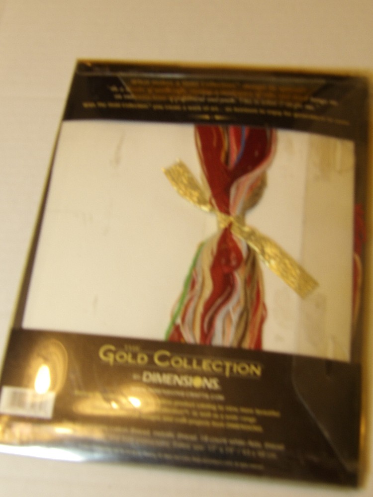 The Dimensions Gold Collection Papal Tribute Pope John Paul II Cross Stitch Kit features a religious theme with framed picture style. The kit includes a needle, color guide, fabric/cloth, and thread/floss for creating a cross stitch of Pope John Paul II, paying tribute to his papacy. The packaging has yellowed with age, the kit is new and has not been opened.