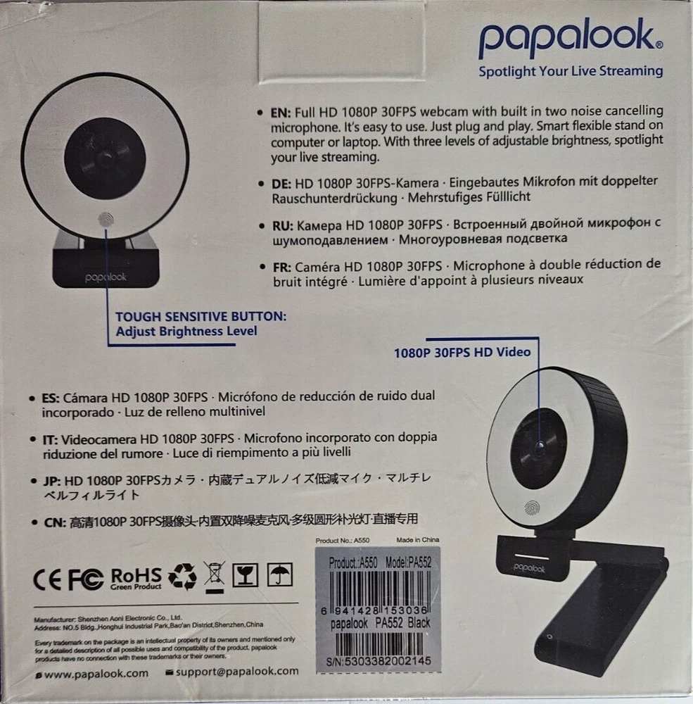 Color:BlackManufacturer Warranty:Limited Lifetime WarrantyCountry/Region of Manufacture:ChinaMaximum Photo Resolution:1080pMPN:PA552UPC:6941428153036Features:Built-in Microphone, Auto white balance, noise canceling microphone, three levels adjustable brightnessModel:PA552Maximum Video Resolution:1080pBrand:PAPALOOKConnectivity:USBgtin13:6941428153036Frame Rate:30 fps