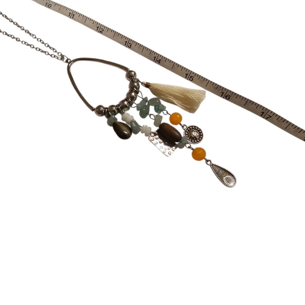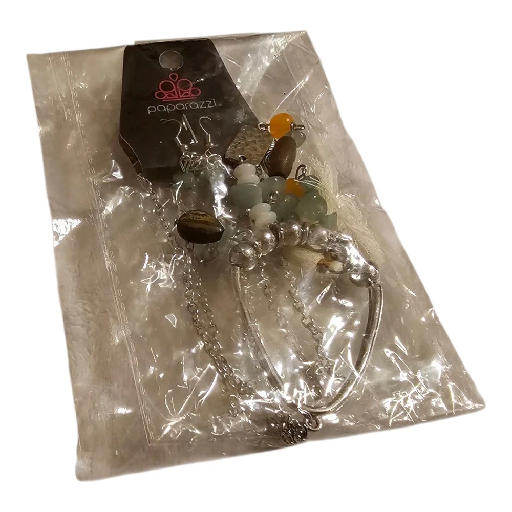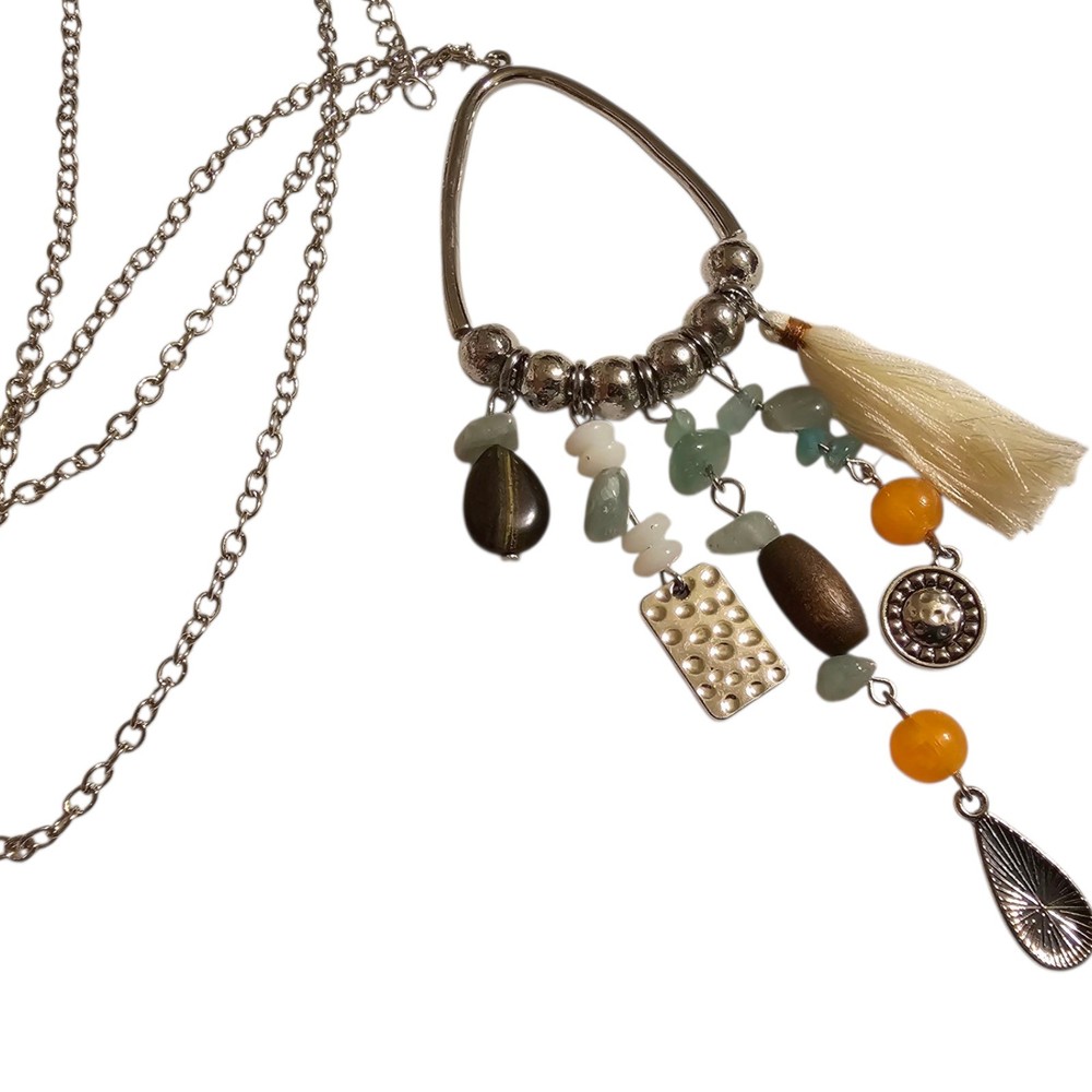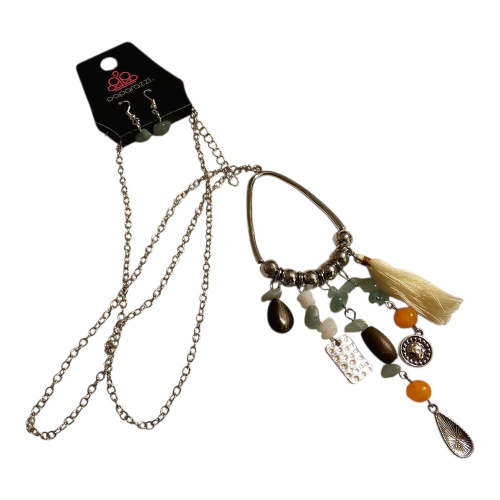 ✨️Paparazzi 2 Piece Jewelry Set; Necklace and Earrings ✨️Listen To Your Soul set ✨️Infused with a multicolored collection of natural stone beads and pebbles, stacks of textured silver charms and mismatched wooden beads create earthy tassels at the bottom of a silver beaded teardrop frame. Enhanced with a shiny white threaded tassel, the whimsical fringe swings from the bottom of an extended silver chain for a seasonal finish. Features an adjustable clasp closure. ✨️NWT! ✨️This is a very long Necklace. Measurements shown are with the Necklace closed on its tightest loop so there is potential for it to be longer. ❤️From a smoke-free, pet-loving home but pets are kept away from my items. Please see all photos as this is the exact item you will receive in the exact condition shown❤️