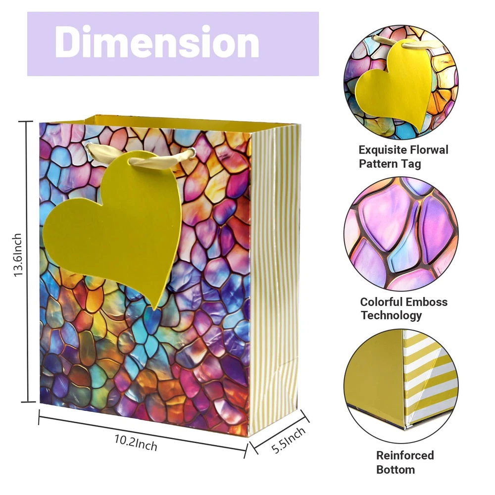 【Value Package】:These vibrant, colorful embossed seashell gift bags come in a variety of cheerful shades, making them perfect for birthdays, weddings, and other celebrations and special Days. The inclusion of handles is a thoughtful touch, making it easy to carry them around, even when filled with goodies. Each bag also comes with tissue paper, adding to the convenience. While they are not the most heavy-duty bags out there, they held up well for lighter gifts and party favors. and having 6 bags and 8pcs tissues in one package is a great deal. 【Exquisite Pattern】:Our gift bag combine exquisite pattern design with handle.It elevates your overall style by incorporate gorgeous elements ,no matter where you went and whatever you did,you always used it. 【Premium Gift bags】:The gift bags provides sturdiness and classfy, you can dress them either up or down depending on your needs. strong enough to accommodate some weight (a book or multiple items). You can use colorful tissue paper to wrap paper for gifts, what is more, you can diy all variety of art works. 【Use Widely】 : These delicate gift bags are suitable for birthday parties, Visting friends, weddings or other celebrations. Also suitable for shopping,wedding bags, party bags, graduations, Holiday, Valentine's Day, Mother's Day, Thanksgiving Day, and more. 【After-Sale Service】:If you have any problem about our product, please with us feel free,we will try our best to solve it for you,your saticfaction is the most motivation that we keep forward.