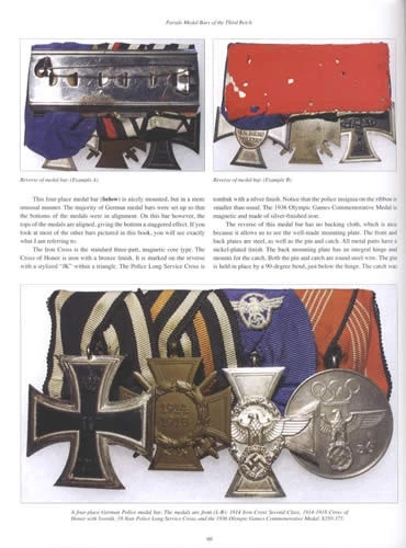 Collector Bookstore Collector Bookstore 724 Delaware Street Leavenworth, KS 66048 Collector Bookstore is a leading specialty retailer of price guides and reference books to inform and educate collectors and professionals in the antiques and collectors markets. Our customers include individual collectors, dealers, appraisers, auctioneers & other industry professionals. You won't receive heavily thumbed shelf copies from us! We buy most titles directly from the publisher and individual authors. Authors are encouraged to submit their reference titles for our consideration. SO-SCM-2008-9780764330919-X3 Parade Medal Bars of the Third Reich (German WWII) by Thomas Yanacek ISBN: 9780764330919 Book Title: Parade Medal Bars of the Third Reich Author: Thomas M. Yanacek Binding: Hard Cover with dust jacket Copyright: 2008 Pages: 196 Size: 8.88 x 11.25 in. Presented for the first time in detail, this examination of German medal bars covers a subject long overlooked in reference books. Illustrating over one-hundred German medal bars in full color, both obverse and reverse views are shown, as well as close up images that highlight some of the finer details. Medal bars of the military, police, political, and civil organizations are covered. Examples of original award documents are shown, as well as period photographs of medal bars in wear. Information is also presented on maker markings, medal identification, the material used to make the medal, finishes, and measurements. Over 400 color/bw images (Description generated 2025-02-07) 27e4525f544694680b0b69ee4b5935da