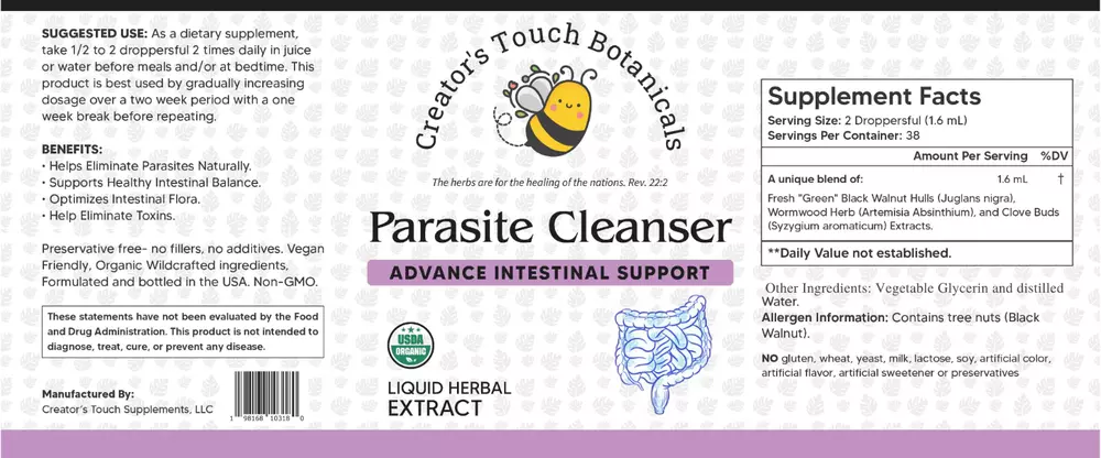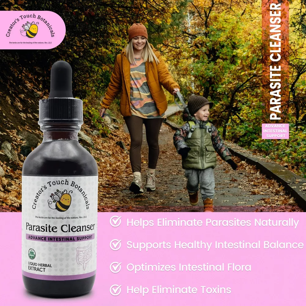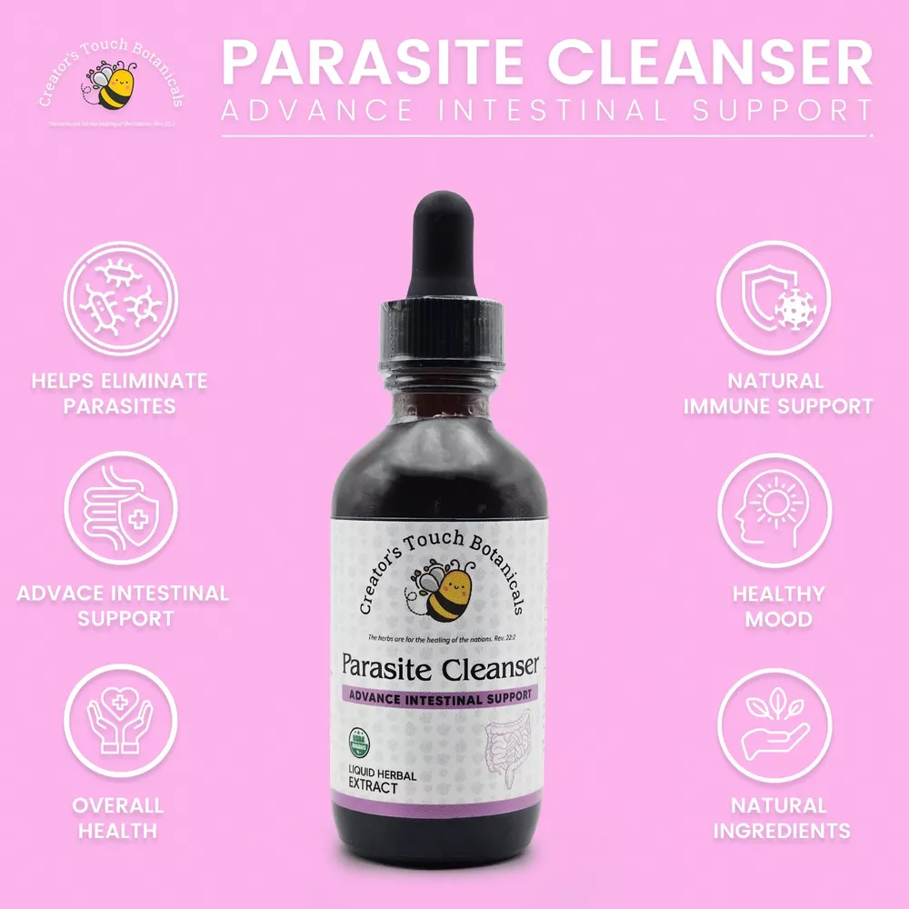 Introducing Creator's Touch Botanicals Parasite Cleanser Extract, a potent blend of natural ingredients using an alcohol free method and using a kid's friendly or Adult that would like to avoid alcohol made tinctures this one is meticulously formulated to support the body's natural ability to eliminate parasites and promote intestinal health. Crafted with premium botanicals including Green Black Walnut Hulls, Wormwood Herb, and Clove Buds, our extract offers a comprehensive approach to parasite cleansing, helping you reclaim your vitality and well-being. 1. **Green Black Walnut Hulls**: Known for their antiparasitic properties, Green Black Walnut Hulls contain juglone, a compound with potent antimicrobial effects against a wide range of parasites. They help to expel parasites from the body by disrupting their reproductive cycles and weakening their ability to thrive in the intestines. 2. **Wormwood Herb**: Wormwood has a long history of use in traditional medicine for its anthelmintic properties, meaning it can help expel parasitic worms from the body. It contains compounds like artemisinin that are effective against various parasites, including roundworms, hookworms, and tapeworms. 3. **Clove Buds**: Clove Buds possess powerful antiparasitic and antimicrobial properties due to their high content of eugenol, a potent compound that can help eliminate parasites and inhibit their growth. Clove also aids in the detoxification process by supporting liver function and promoting the elimination of toxins from the body. By combining these potent botanical ingredients, Creator's Touch Botanicals Parasite Cleanser Tincture offers a holistic approach to parasite cleansing, targeting parasites at different stages of their life cycle and supporting the body's natural detoxification pathways. Whether you're experiencing symptoms of parasitic infection such as digestive discomfort, fatigue, or skin irritations, our tincture can help you restore balance and vitality. Experience the transformative benefits of natural parasite cleansing with Creator's Touch Botanicals Parasite Cleanser Tincture. Incorporate it into your wellness regimen to support intestinal health, eliminate parasites, and reclaim your vitality naturally. Say goodbye to unwanted guests and hello to a healthier, happier you. Hope you love our product! Please let us know if you have any questions! We will be glad to help! Please if you love our product kindly leave us a review! Your review help us grow and share our remedies to help others in need! If for some reason you are dissatisfied with our product, before leaving us a bad review kindly provide us an opportunity to make it right! Send us a private message and we will help you as best as we can to make you happy! ALL PRODUCTS ARE MADE IN THE USA> Thank you for shopping with us! Please visit our other items at our EBAY store!