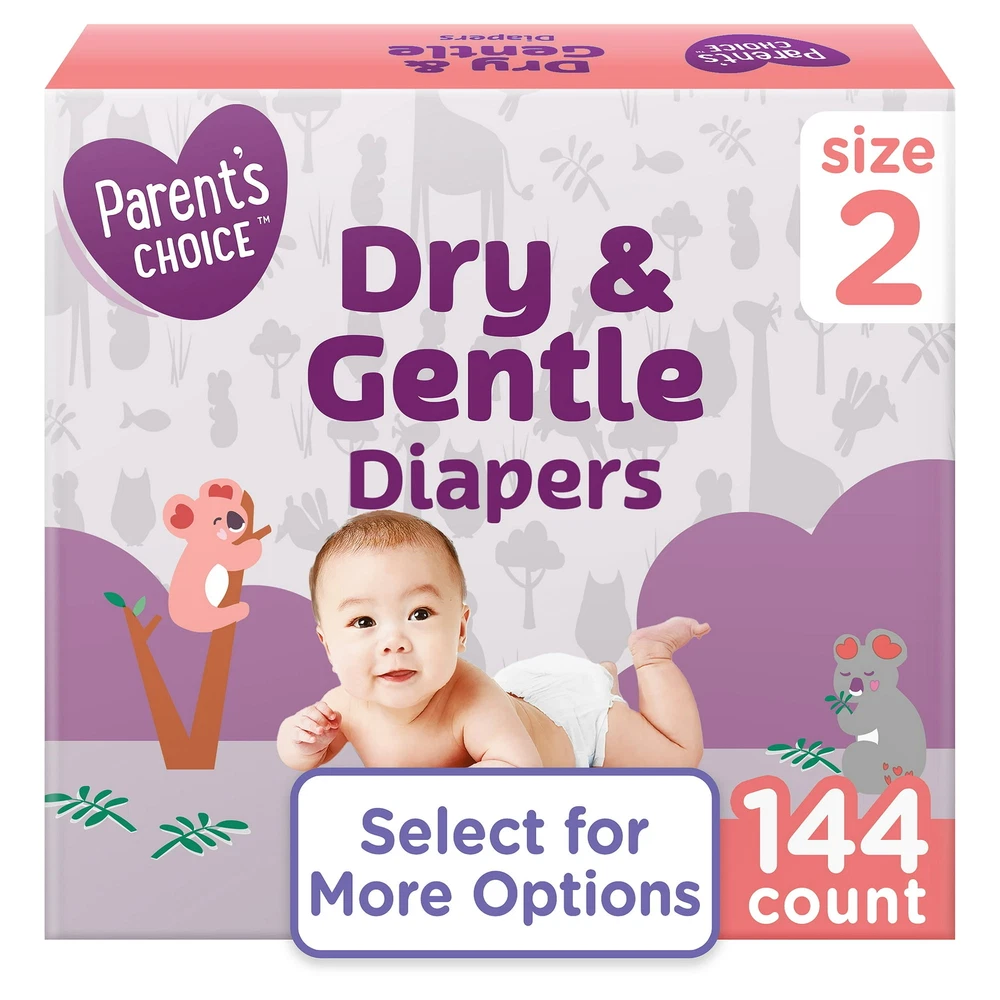 About this item Parent's Choice Dry & Gentle Diapers Size 2 DryNOW channels absorb quickly to help keep skin dry and healthy Wetness indicator changes colors Made from extra-soft breathable materials for ultimate comfort Dermatologically tested Wiggle-proof leak barriers Products not tested on animals