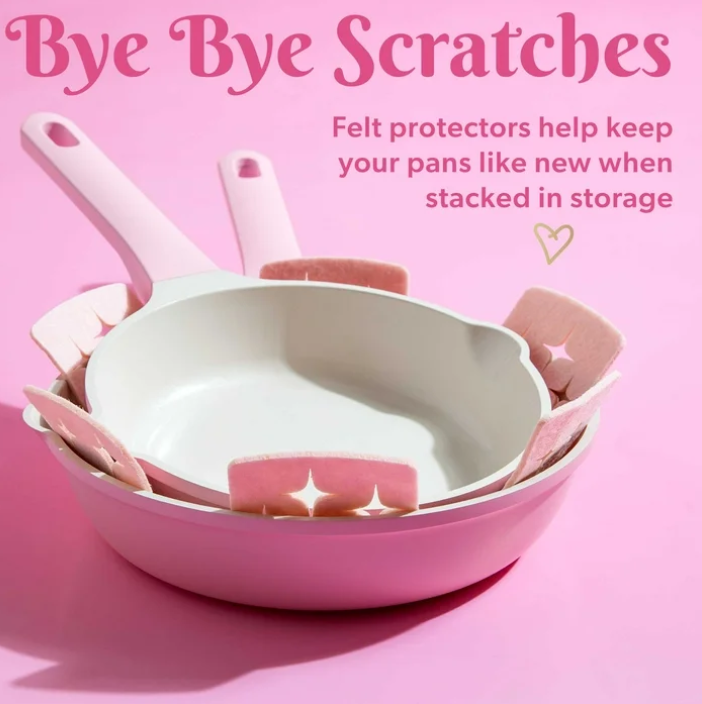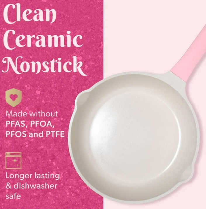 Product details Paris Hilton 10pc Cookware Set - Pink 10-PIECE CLEAN CERAMIC NONSTICK COOKWARE SET: Includes an 8" fry pan, a 10" fry pan, a 2-quart saucepan with a glass lid, a 4.3-qt Dutch oven with a glass lid, and two 13." and two 17.5" pan protectors to keep your pots and pans shiny and scratch-free. SO CUTE: The tempered glass lids feature shiny gold heart knobs. Loves it! HEALTHIER COOKING: The dual layer Clean ceramic nonstick coating is made without PFAS, PFOA, PFOS & PTFE, so you can cook with confidence. THAT'S SMOOTH: The smooth, non-stick coating allows food to slide right out of the pan without adding extra oils, empowering a healthy choice like a #bossbabe. SLIV AND SIZZLE: The durable premium cast aluminum construction ensures fast and even heat distribution, giving you cooking results that are so beyond. COOK IN STYLE: Soft touch, stay-cool comfort handles offer a confident grip while you fry up culinary masterpieces. SERVE LIKE A PRO: The convenient pour spouts help to pour sauces and soups with ease. DISHWASHER SAFE: No need for scrubbing because this pan is dishwasher safe. #BeAnIcon: Post your photos with #BeAnIcon for a chance to be shared on Paris' social media! Specifications Brand Paris Hilton Collection Be An Icon Piece Count 10 Pan Material Cast Aluminum