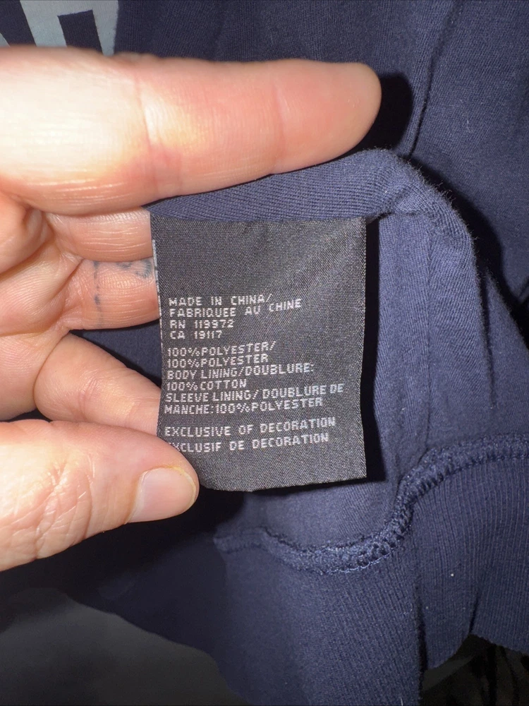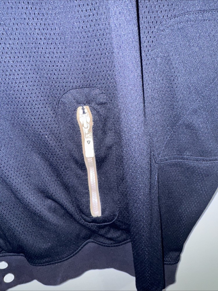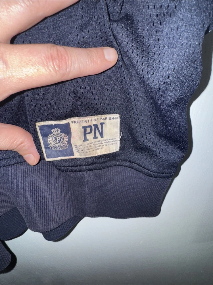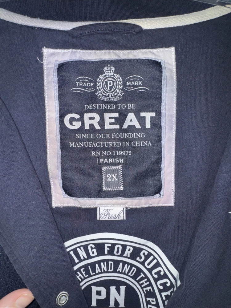 Please note there is some discoloration on the zippers. There are photos showing the slight discoloration. The Parish Nation Destined To Be Great Jacket is a navy varsity jacket in size 2XL, made from polyester material. This jacket features a full zip closure, making it easy to put on and take off. It is designed for men and has a preppy, 90s college-inspired style, perfect for adding a touch of retro charm to any outfit. The zipper accents add a fashionable touch to this classic varsity jacket from Parish Nation.