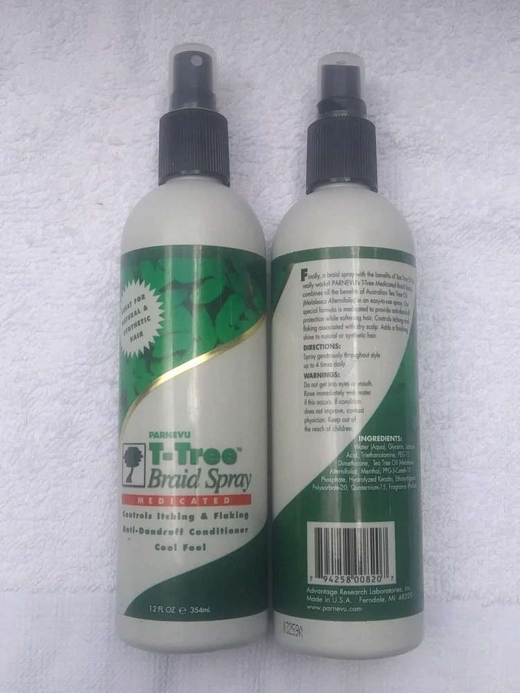 Parnevu T-TREE Braid Spray~Lot of 2~Natural & Synthetic Hair~Controls Itch~12 oz Medicated to control itching & flaking Anti-dandruff conditioner Cool feel No one here smokes but a couple of the cats are pretty heavy drinkers. Payment is due within 3 days. If you need longer, please message me. I package well and ship quickly. I happily combine shipping on multiple purchases within the same week. If you need to return an item, please use Ebay Returns. If you have a problem with an item, please get in touch with me before going through Ebay or leaving feedback. I'm sure we can find a solution. Please remember I'm human and sometimes make a mistake.