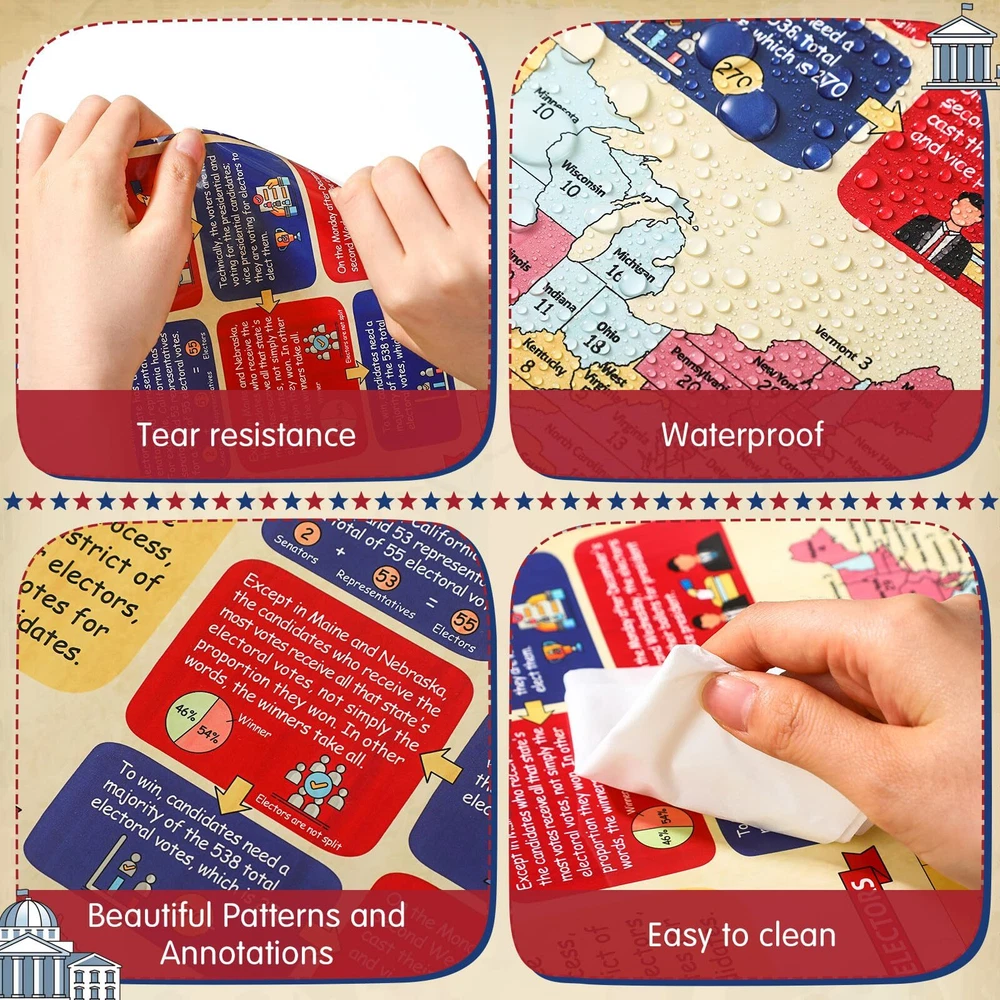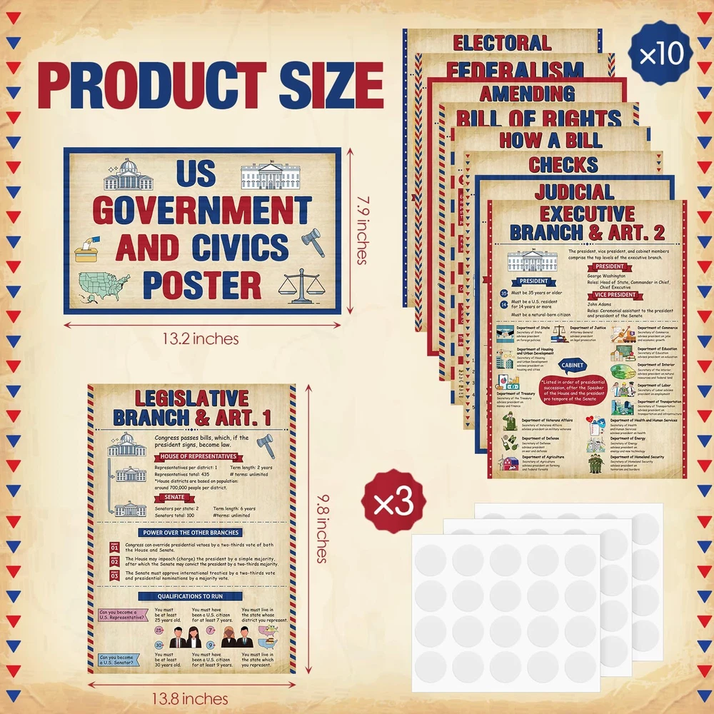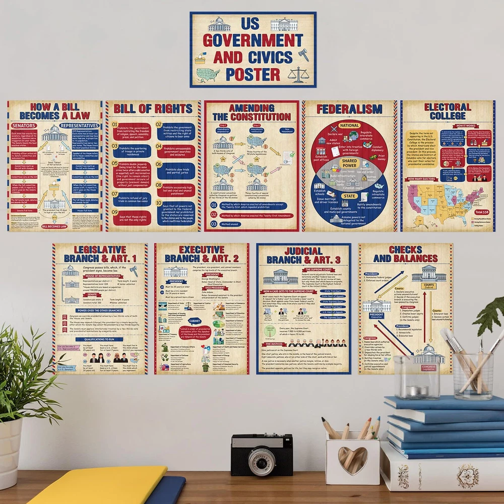 Features: The title of the US government and civics poster is large and clear, so there is no need to worry about students not being able to see it clearly, allowing students to remember it more deeply and understand it more intuitively. This US government classroom posters set teaches children about how the US government works and is suitable for school social education needs, social room decoration or home education needs. Specifications: Material: paper Color: multicolor Size: social studies poster measures about 13.8 inches x 9.8 inches, and the title poster measures about 7.9 inches x 13.2icnhes Package includes: 1 x Title Poster, 9 x Social studies posters Notes: Manual measurement, please allow slight errors on size. The color may exist a slight difference due to different screen displays. What You Get: uS government posters Includes 1 Title Poster, 9 social studies posters such as: legislative Branch, Executive Branch, Judicial Branch, Checks and Balances, Amending Constitution, Electoral College, and more, 60 adhesive points; Their beautifully designed, colorful pictures are eye-catching and will easily capture students' interest Durable Materials: each social studies poster measures 13.8 inches x 9.8 inches, and the title poster measures 7.9 inches x 13.2icnhes; Made of quality paper and waterproof membrane, our social studies classroom decorations are reusable, tear-resistant, and easy to clean Outstanding Design: these US government and civics poster bulletin board decorations are designed to fit the theme; Social studies educational posters are visually appealing to inspire their interest in social studies and can help increase students' interest in social studies while reviewing any key information they have learned School Educational Supplies: ideal for educational supplies and craft supplies, these social education posters are designed to enhance students' understanding of different US government and civics and cultivate knowledge acquisition skills; Dispensing glue helps you easily display them on classroom walls, home, tutoring areas and even toy rooms Wide Application: these government posters for classroom can be applied as classroom decoration and teaching tools, you can use them to decorate walls, bulletin boards or other places where students can easily recognize them, helping them learn and understand history, citizenship and government, they are also The nice gift to support middle high school students, families, and teachers in their learning journey