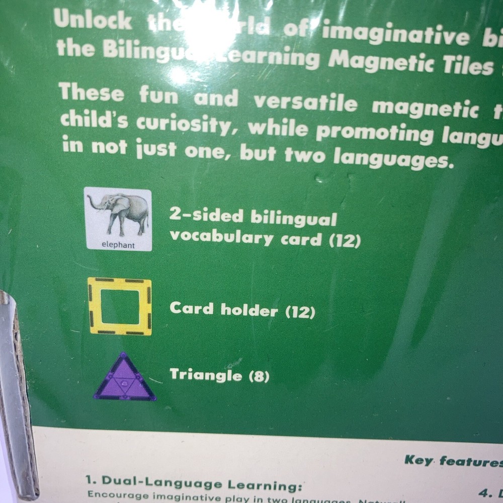 The product is a set of magnetic tiles for kids, designed to help them learn French and English. The tiles are from the Passionfruit Kids brand and come in a Safari color pattern. The package dimensions are 6.89x5.87x2.13 inches and the weight is 1.48 pounds. These tiles are part of a complete set and are suitable for building toys and blocks.