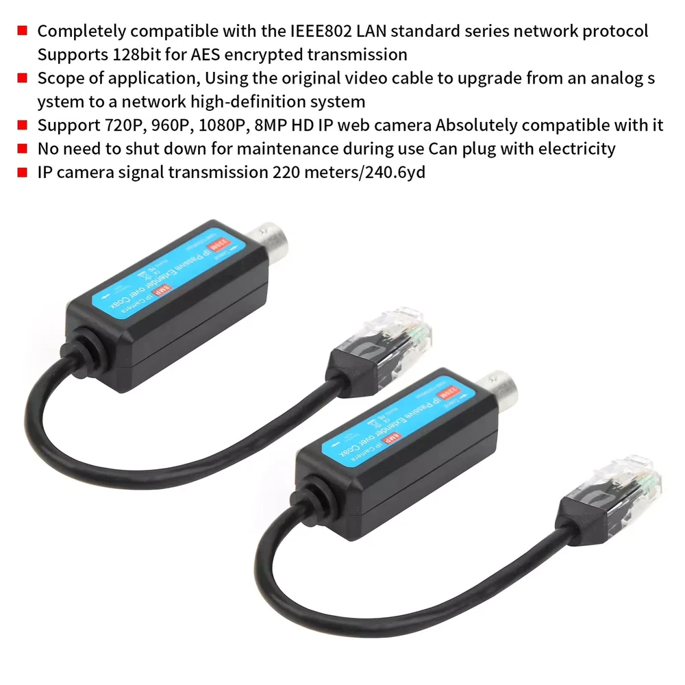 Product Description Passive Coaxial lP Extender 10/100mbps lEEE802.3 RJ45 CCTV Camera Accessories Features: 1. Completely Compatible With The lEEE802 LAN Standard Series Network Protocol, Supports 128bit For AES Encrypted Transmission 2. Scope Of Application: Using The Original Video Cable To Upgrade From An Analog System To A Network High-Definition System 3. Support 720p,960p,1080p,8mp Hd Ip Web Camera Absolutely Compatible With It 4. No Need To Shut Down For Maintenance During Use Can Plug With Electricity 5. IP Camera Signal Transmission 220 Meters/240.6yd Specifications: Product Name: Single Channel Passive IP Transmitter/Receiver Applied Devices: CCTV Cameras, Monitors, DVR, Switchers, IP Encoders, Etc Video Format: PAL, NTSC, SECAM Standard: lEEE802.3 10Base-T Bandwidth: 10/100Mbps Impedance: 500 To Dual 100Ω Or 75Ω To Dual 100Ω Or 93Ω Todual Max Distance: 220m Crosstalk: >30db Connector: Female BNC, RJ45 Jack Cable: Coax Cable (RG59) Power: No External Power Required Housing: ABS Engineering Plastic Body Color: Black Operatingtemperature: -20°C~70°C Relative Humidity: 0~95%(Non-Condensing) Storage Temperature: -40°C~150°C Package List: 1 Pair Passive Coaxial lP Extender About Us Welcome to the our store! You can chat with us about anything to do with our products. we dedicated to provide best products and services. Payment All ebay verified payments are accepted, if you have any questions about the payments, you can let us know, we will try our best to solve this for you. Shipping We usually ship all packages within 24 hours after payment and 48 hours at latest for a small part of our products. Returns Always believe we can solve your questions about our products with communication. And if it comes to a return at last, the item must be intact and the same condition when you received it, also the return is only available within 30 days after delivery. Contact Us You can contact us at any time via ebay messages, we will reply at the first time in the working times. We will always be here for you! Working time: 9am to 6pm, Monday to Friday. You may also like New High Quality Sapphire Watch Glass Replacement Part For Casio MDV-106 19.99 USD 3.69 USD 100Pcs Microphone Pop Filter Hygiene Mike Foam Cover Odor Removal Disposable 13.96 USD 4Pcs Upgrade Axle Arms With Motor(2A+2B) For E58 JY019 FPV RC Drone Quadcopter 8.99 USD 3.69 USD 1/4 Screw Adapter Mount Base With Screws For GoPro Max Hero 10 9 8 Black Camera 8.99 USD 3.69 USD Anti Snore NASAL DILATORS Stop Snoring CONES Breathe Easy NOSE Congestion 2.95 USD 3.69 USD 8 in 1 USB Programming Cable+Software CD For Motorola Baofeng Kenwood HYT Radio 10.95 USD 3.69 USD powered by