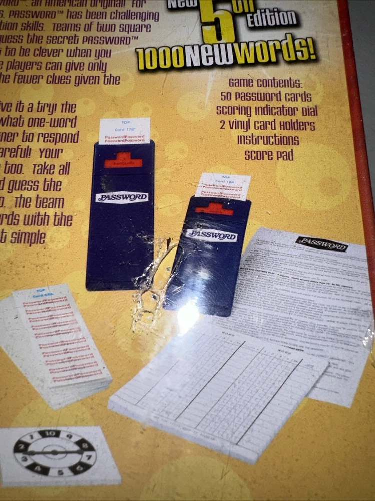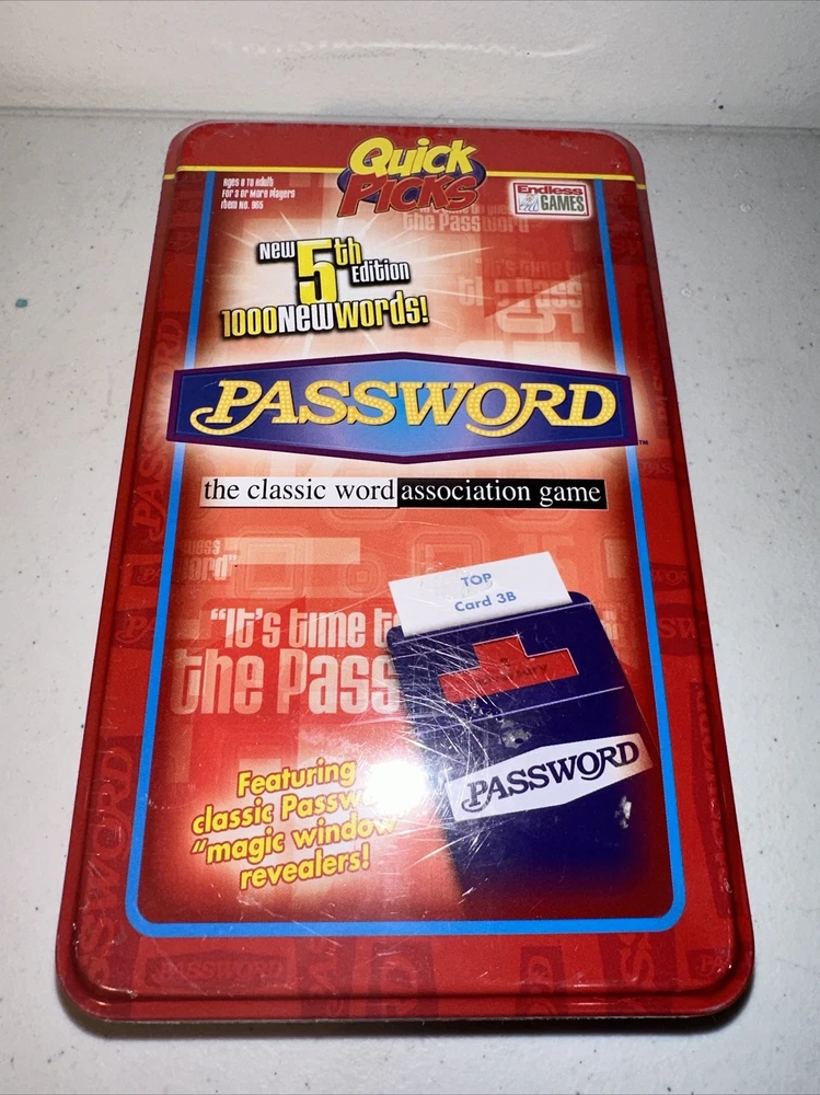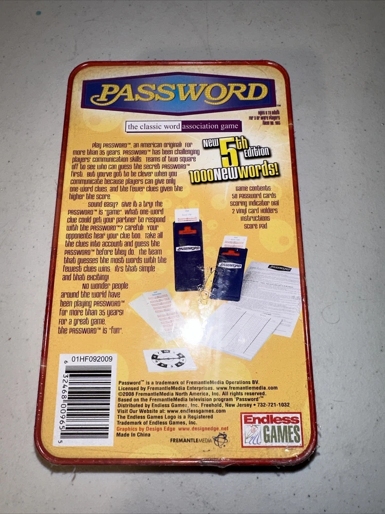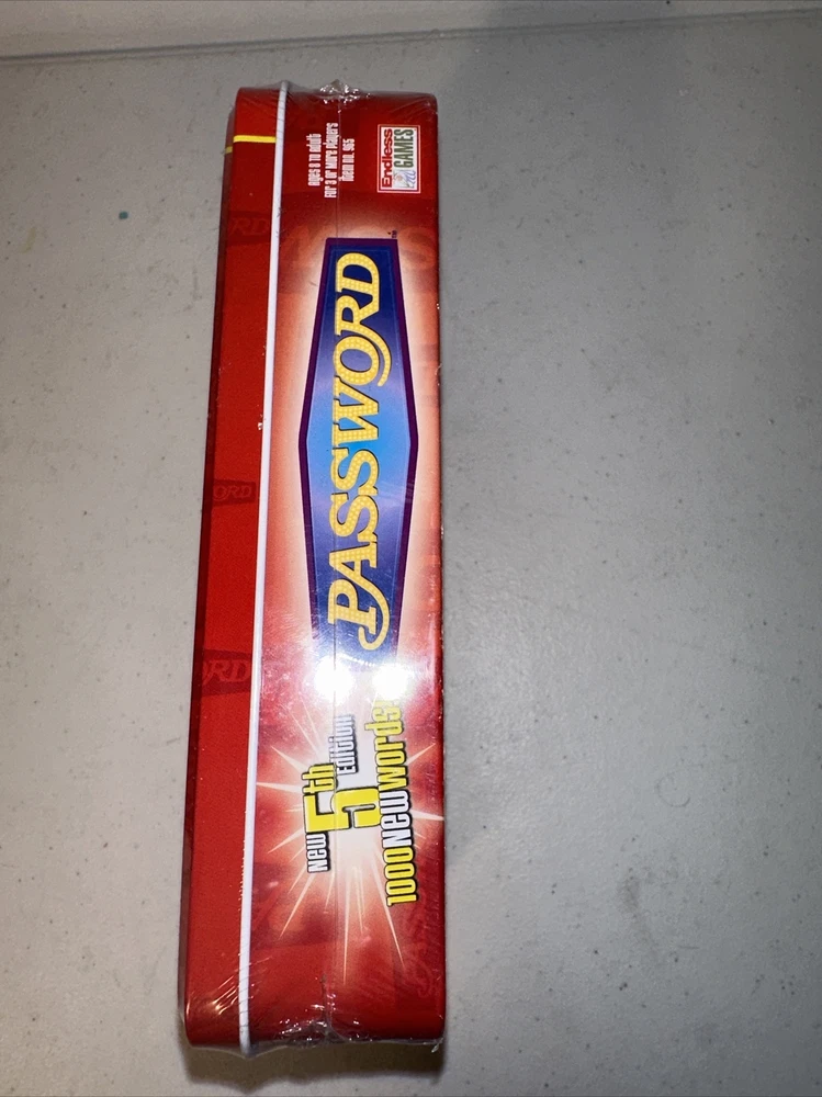 This Endless Games 5th Edition of Password is a complete word game for 2 or more players, perfect for parties and family game night. The game includes cards with various words and players give clues to help their team guess the word without using any of the forbidden words listed on the card. The game is suitable for players aged 8 years and above and comes sealed in its original packaging. The game title, Password, is a classic strategy game that has been entertaining families since 1961. Get ready to put your word skills to the test with this fun-filled game!