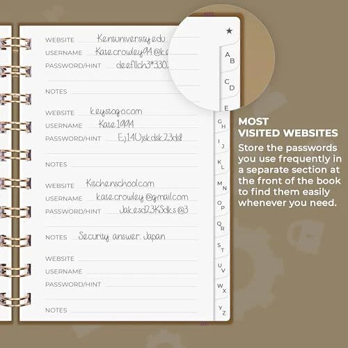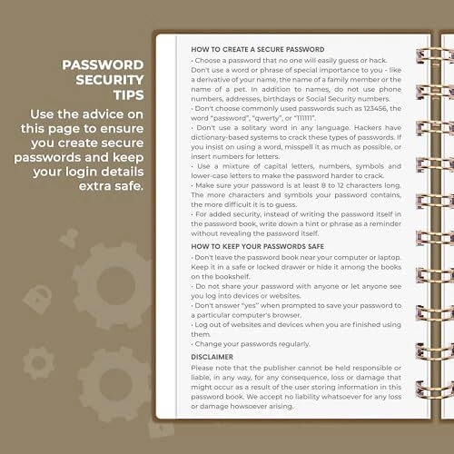 Return Policy Fast Delivery Trusted seller Password Book Spiral – Mini Internet Address & Password Organizer with Laminated Alphabetical Tabs – Small Password Keeper Journal – Hardcover, Pocket Size, 4.7x5.7” (Brown) Product Description FIND ANY PASSWORD YOU NEED EASILY: Tired of wasting precious time remembering the right password? With Spiral Password Book, you can record up to 440 passwords and organize them alphabetically, so you can find any password you need in no time. TAKE YOUR INTERNET SAFETY TO THE NEXT LEVEL: Every day, hackers come up with new ways to steal valuable data stored digitally. This password keeper book is an effective way to keep your login details offline, so no hacker can ever reach them. Moreover, you can now create unique, complex passwords for each account without risking forgetting them. LAMINATED TABS, SPIRAL BINDING & OTHER FEATURES: This password journal has convenient letter tabs to easily locate any information you need. The tabs are laminated to ensure they withstand daily wear and tear. Durable double wire binding helps you flip the pages effortlessly and write comfortably wver you are. The internet password book with tabs also features a convenient elastic band to keep the pages together, plenty of lined pages to add extra notes, and a back pocket for loose papers. MADE TO LAST WITH PREMIUM-QUALITY MATERIALS: We ensure this password organizer lasts a using only premium-quality materials. The password manager has a soft-touch vegan leather hardcover and thick 120gsm paper that is bleed- and smudge-resistant. The password log book comes in pocket format and measures only 4.7 by 5.7 inches, so you can carry your mini password book in a purse and use it on the go. GUARANTEE & RETURNS – We hope that our small password book with alphabetical tabs will help you store and use your login details efficiently. Otherwise, we will happily exchange or refund your internet address and password logbook if you are having any quality issues or are not completely satisfied with your pasword keeper book for any other reason. Reach out to us via an message for an easy refund of this password notebook with alphabetical tabs. Shipping Returns Payment Shipping Shipping is FREE to all addresses other than APO/PO boxes in the lower 48 states. All our stock ships from US-based warehouses. Shipped via USPS or UPS (depending on location and package weight) Unless stated otherwise, all orders will ship within 24-72 hours of your payment being processed. Check our feedback to see the great reviews of FAST shipping we offer. Returns Seller does not accept returns Payment We currently accept payment via eBay managed payments only. Once payment is cleared, we will dispatch your shipment within 1-3 business days. Please refer to the "Shipping" tab for more information regarding shipping speed to your destination.